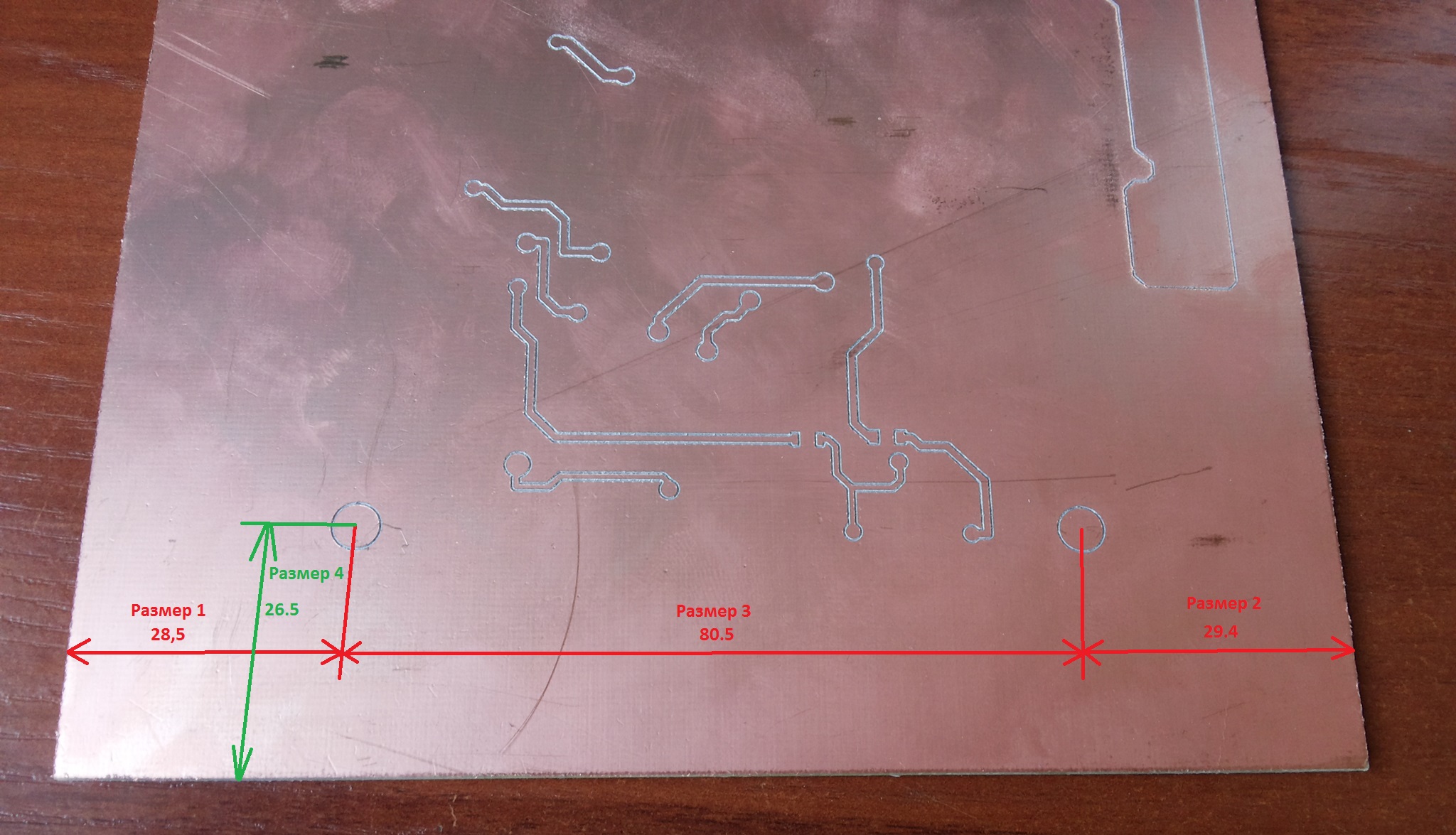 8. После резки первой стороны получаем вот такую картину - плата размещена не в центре заготовки (расстояния между отверстиями внутри так сказать платы совпадают с размерами, замеренными в Sprint-Layout - к примеру размер 3 на рисунках):
