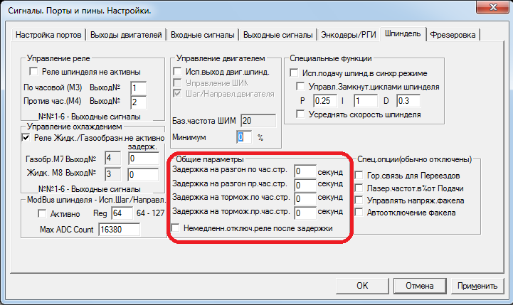 Сейчас поправлю, а то задержка срабатывает нужная = 20 секунд, но осталась такая ерунда - включает шпиндель, сразу же отключает, опять включает и потом уже ждёт 20 секунд.