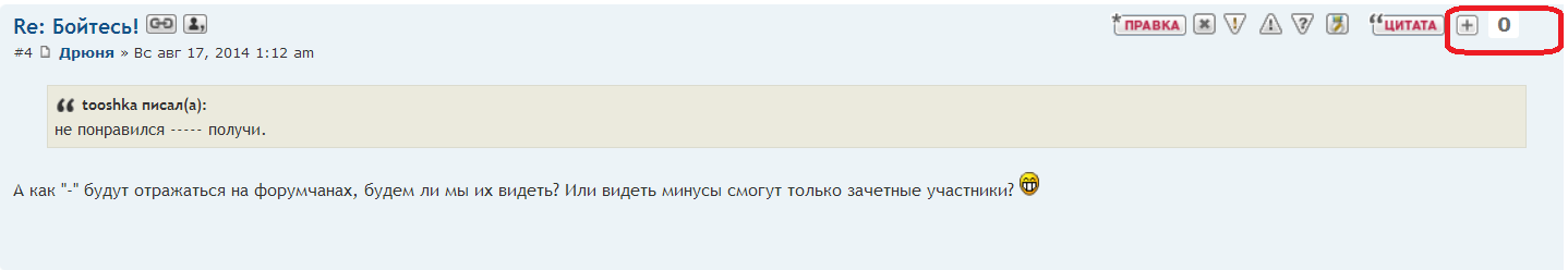 Дрюня писал(а):А как "-" будут отражаться на форумчанах, будем ли мы их видеть? Или видеть минусы смогут только зачетные участники?