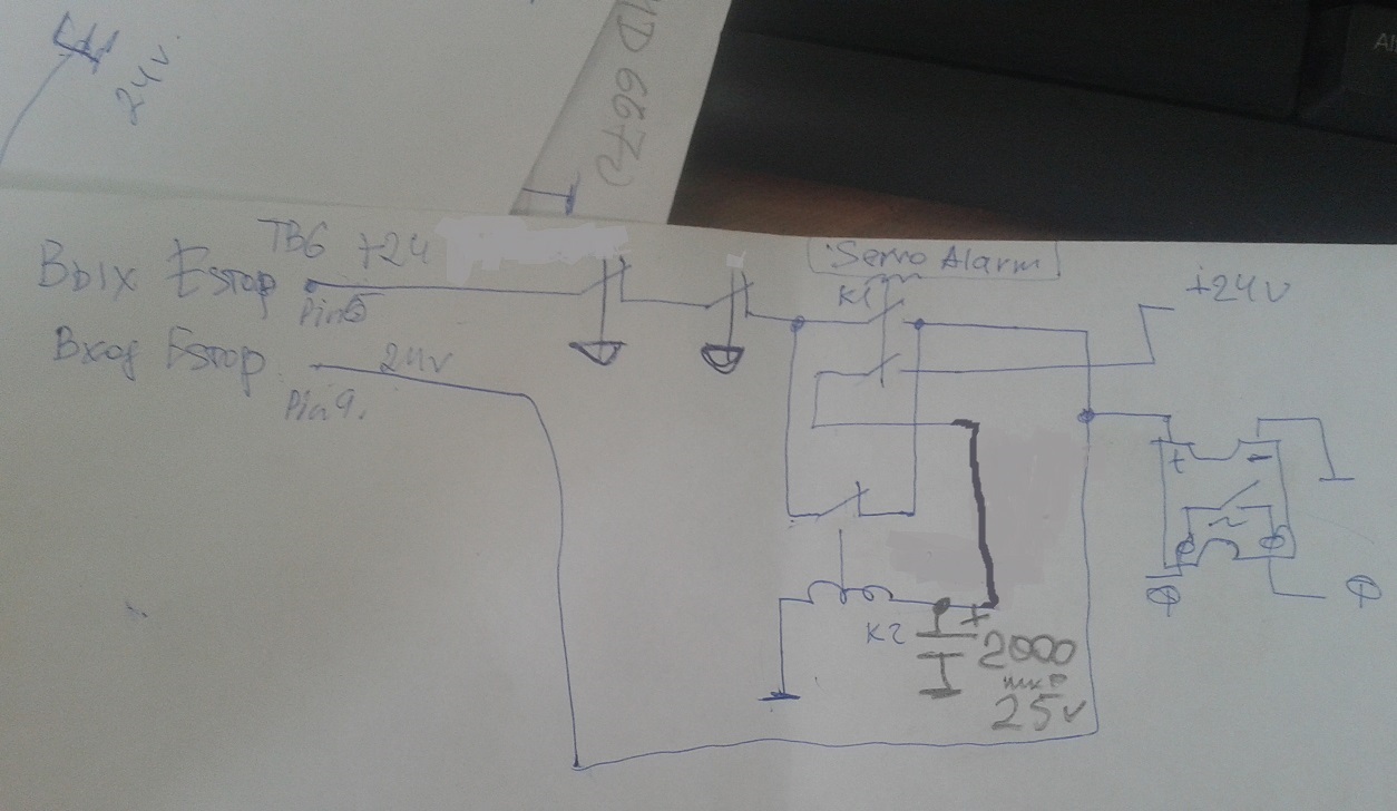 Промучился саварийным реле серв, собрал схему сначала без кондера на 2000мкФ, получалось следующее. При аларме серв срабатывало реле и тут же опять замыкалась вся схема. Кондеры серводрайверов не успевали разрядится. на ТТР сразу же появлялось напряжение, серводрайверы постоянно мигали (впадали в ошибку, не запускались). Решилось подключением конденсатора. Задержка на выключение нижнего реле около 6 сек. Теперь при аларме серв цепь Естоп не замкнется в течении 6 сек. За это время успевают разрядится кондеры в серводрайверах. Надеюсь поймете, что я тут понаписал...