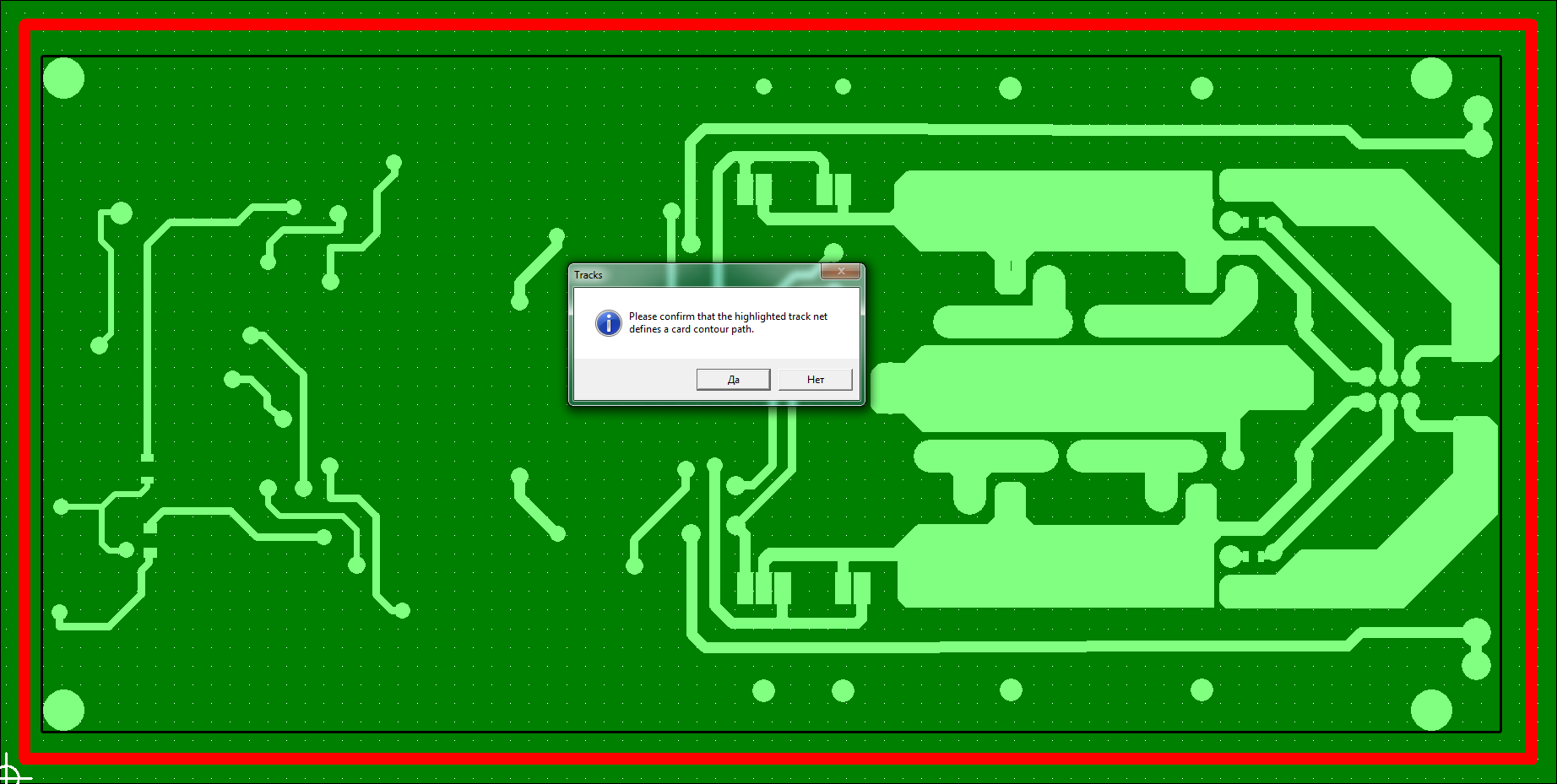 Нет я про то, что цент габаритного прямоугольника вокруг проводников не совпадает с центром габаритного прямоугольника вокруг крепежных отверстий.AlexNikov писал(а):Если вы имеете ввиду этот участок (на фото красным обведено), то это ошибка реза предыдущих раз.