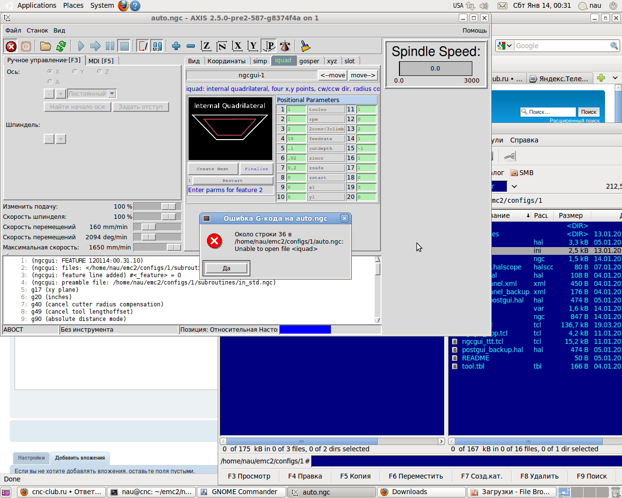 Действительно, все *.ngc файлы типа simp.ngc и т.д. переписал в /home/nau/emc2/nc_files/... и ругаться перестал. Надо поправочку внести в описание процесса установки на 2 странице этой ветки. Надо с другими ошибками разбираться, не все закладки работают, тоже есть ошибки. Но это завтра, а то на часах 4.15 утра...
