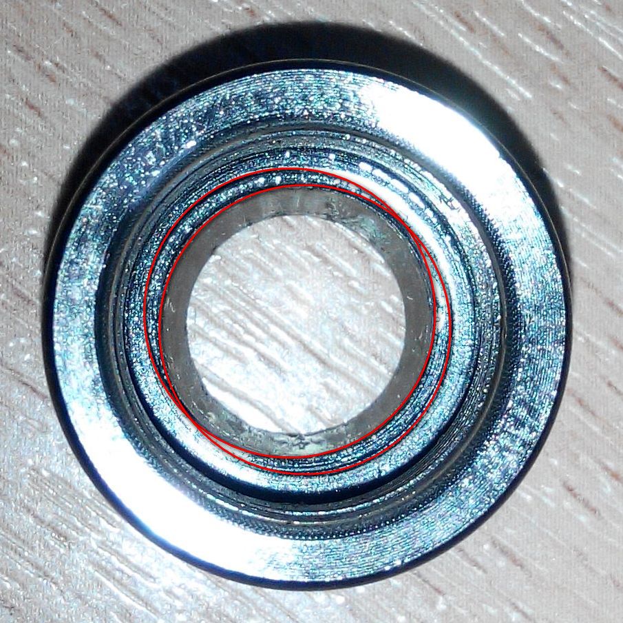 Пришел шпиндель. Не понял, зачем гайка ER-11A имеет эксцентричное отверстие? Или это опять подарок от нашего брата по разуму из Китая? КМК не должно быть такой странности. Конус вроде на месте. Два круга - края реального отверстия и некий след от того, чем его делали. Цанга выпадать из гайки отказывается. Приходится ловить положение, в котором она может быть наклонена и извлечена.