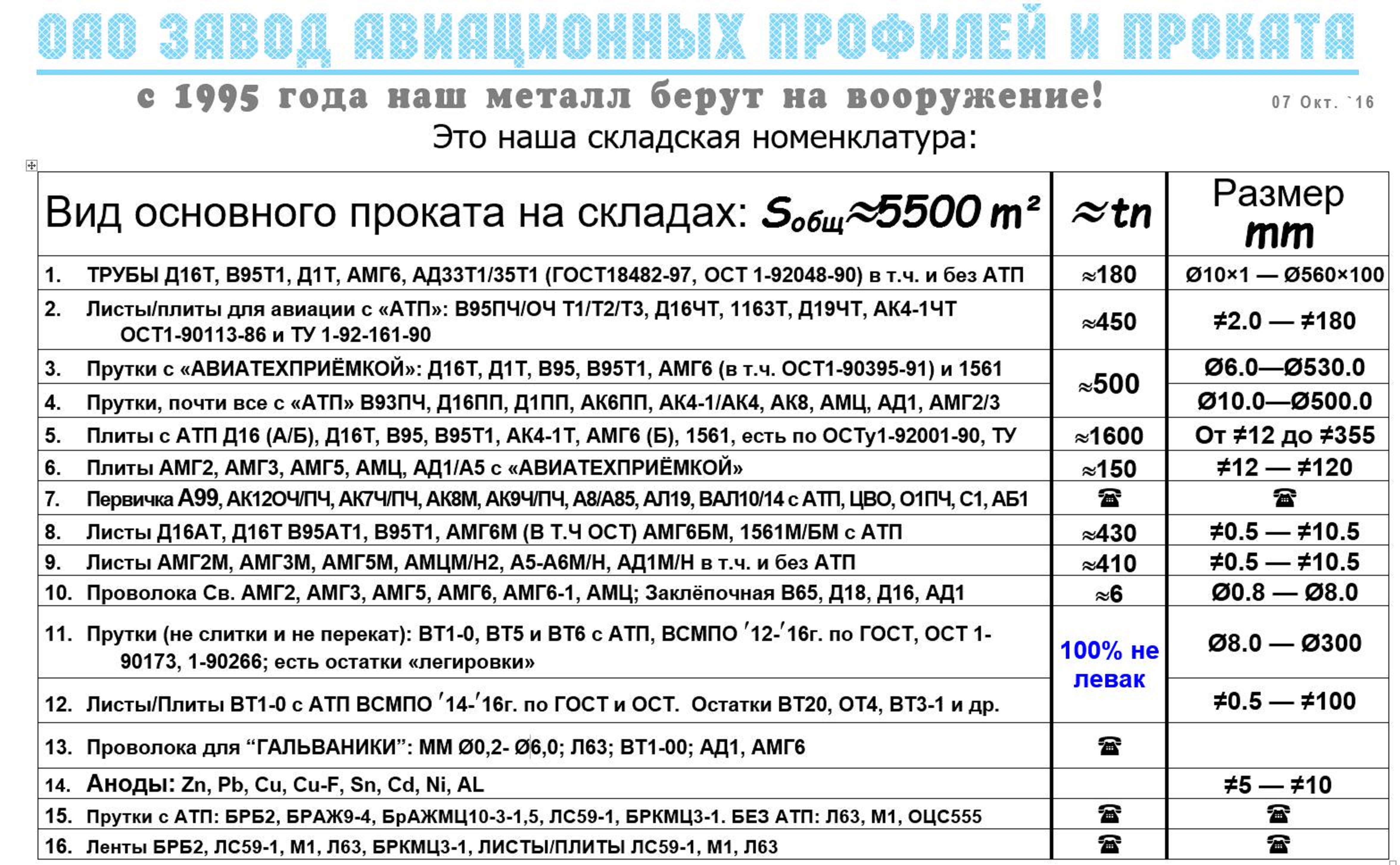 Марки AL проката/сплавов на складе: Д16Т, Д16ТПП, Д16ПП, Д1Т, Д1, АВ, АВПП, Д1ПП, В95Т1, В95, 7075, 7475, 7475Т7351, 7075Т7351, В95ОЧТ2, В95, В95ПЧТ1, В95ПЧТ2