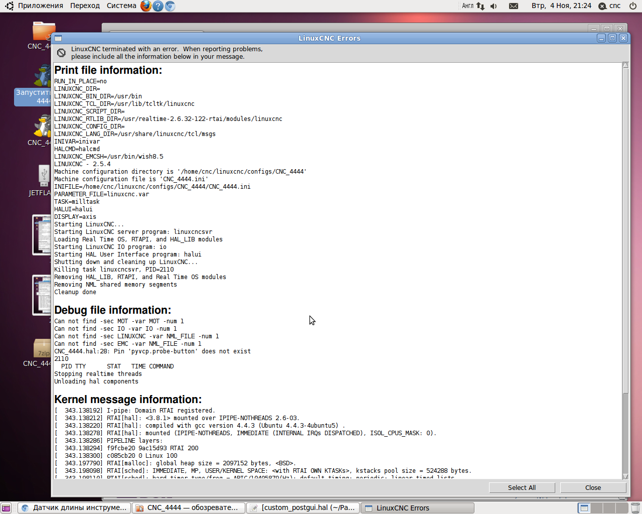 EMC2 теперь запускается и обнуляется. Но при нажатии на кнопку "Инструмент" он же "Probe" вываливается вот что: