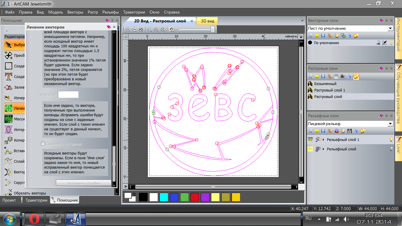 Ну, кроме наложения / пересечения векторов на внутренней окружности, но это никак не мешает дальнейшей работе (если, конечно, не пытаться выделить одновременно все векторы и пытаться при этом заставить ArtCAM разделить их на внешние и внутренние, что в принципе невозможно для такого рисунка).