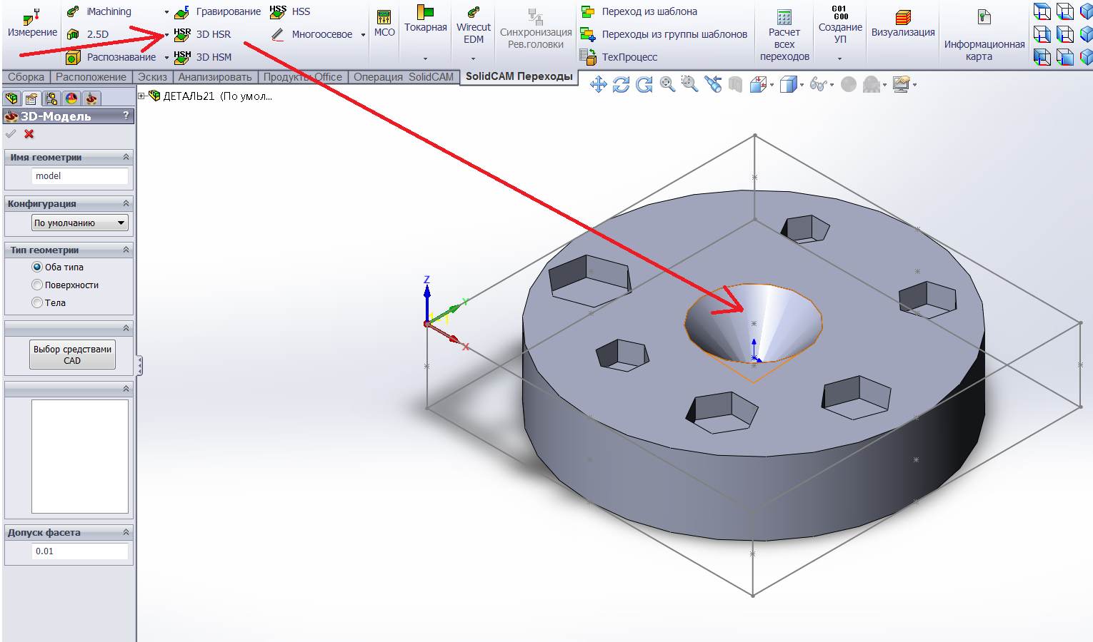 Поискал на тытрубе уроки с использованием 3D HSR и 3D HSM, так эти редиски не показывают как выделяли нужные участки, а использовали заранее заготовленные стратегии обработки и только показывали как эффективно ходит фреза. Подозреваю, что я как-то неправильно пытаюсь выделить нужный мне участок. Но как сделать это правильно я найти не могу.