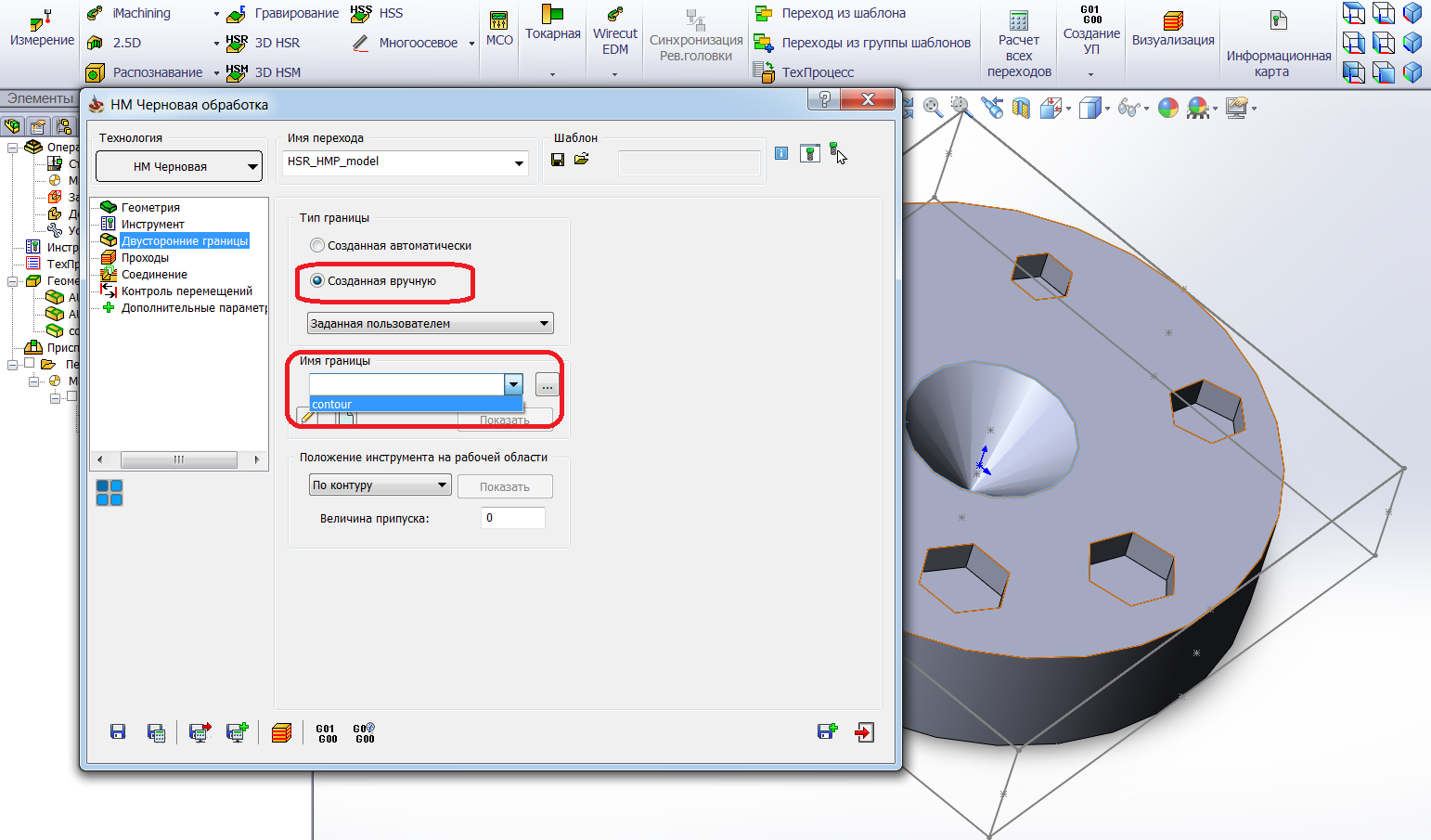 Или рисуем на детали границу обработки (эскиз в Солиде - выходим из Эскиза и Солида)