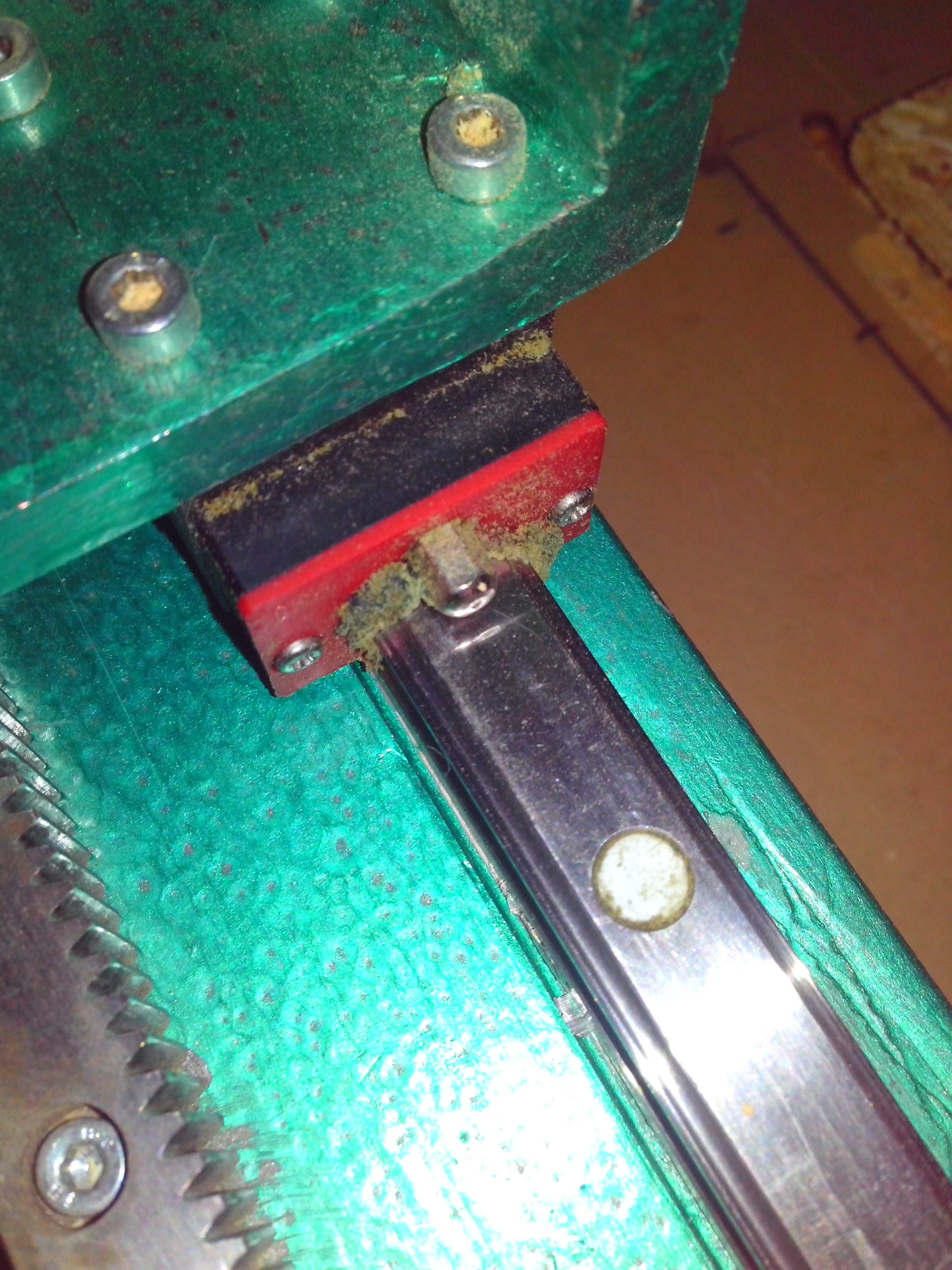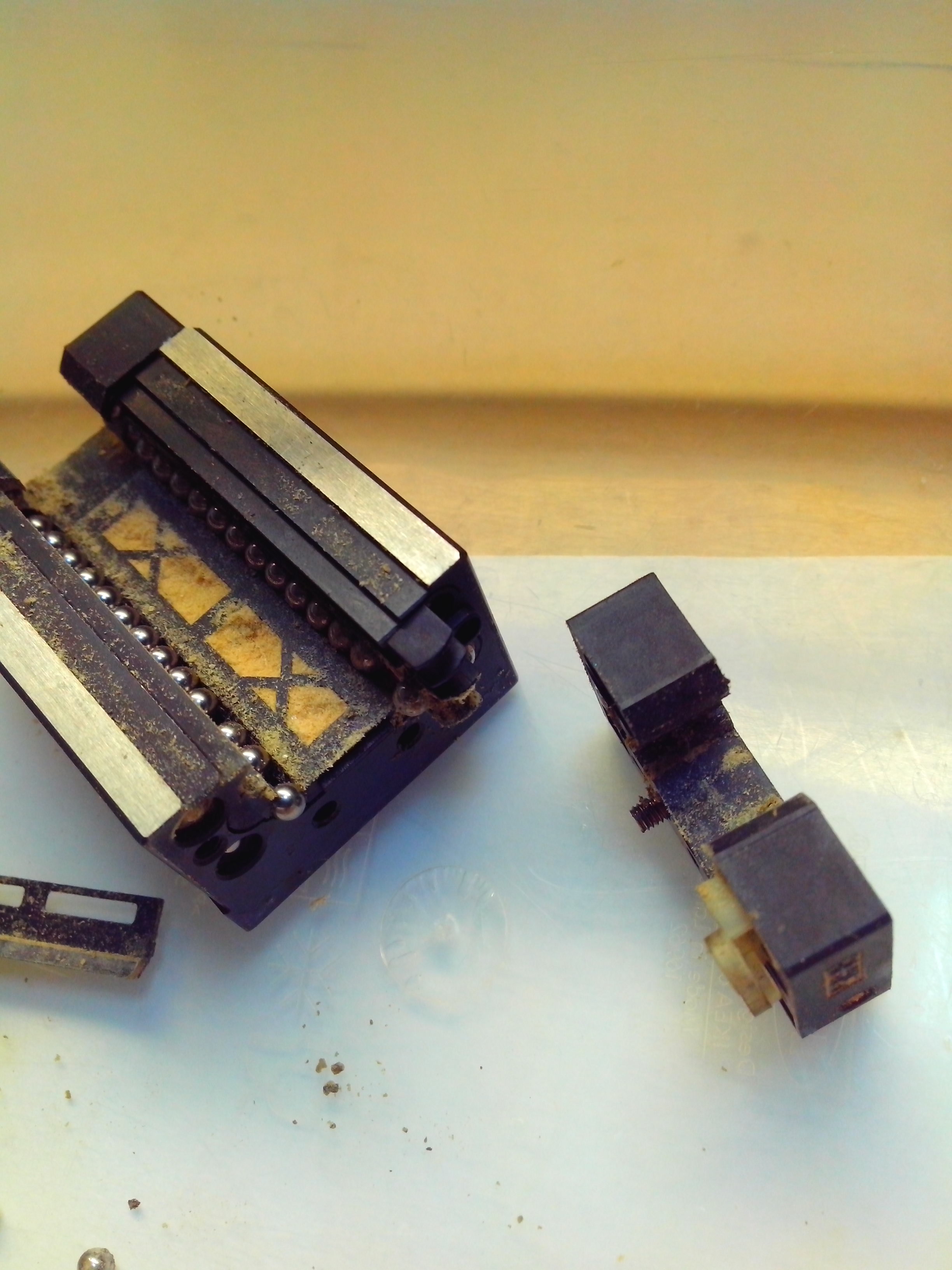 Кстати она не лезет во весь подшипник как я до этого думал, а выпирает после же первого шарика. Поэтому если заправлять такую каретку не снимая с рельсы, то необходимо при заправке передвигать её не меньше чем на 10 размеров корпуса для равномерного распределения, видать я раньше когда видел что лезет со щелей переставал давить а оно вон как оказывается.