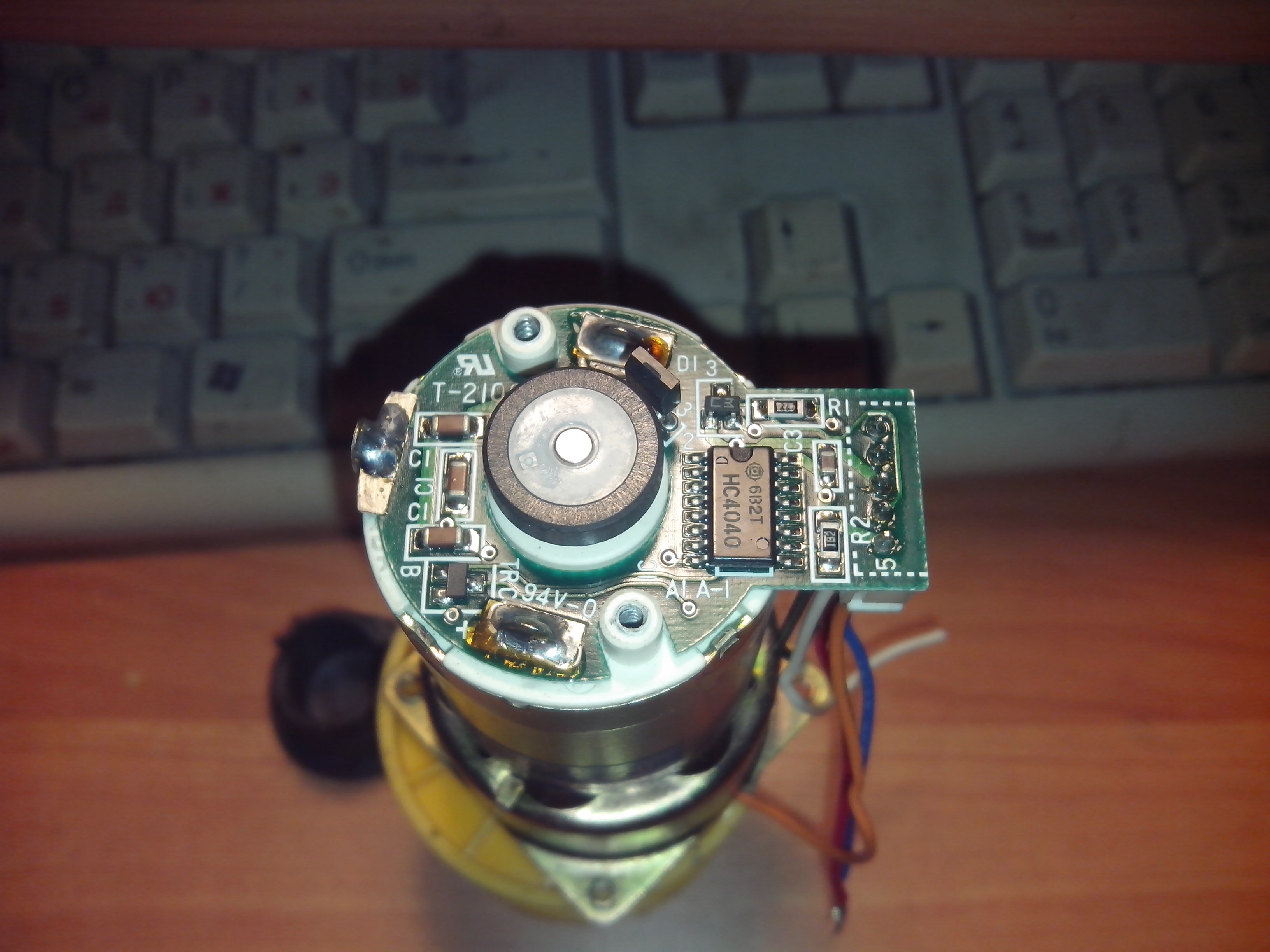 Раздобылись тут пара моторчиков с редукторами, жапонских, на одном из них стоит датчик холла, в обвязке которого микросхема HC4040. С моторчика выходит пять проводков, два из которых идут к мотору, три идут к платке.