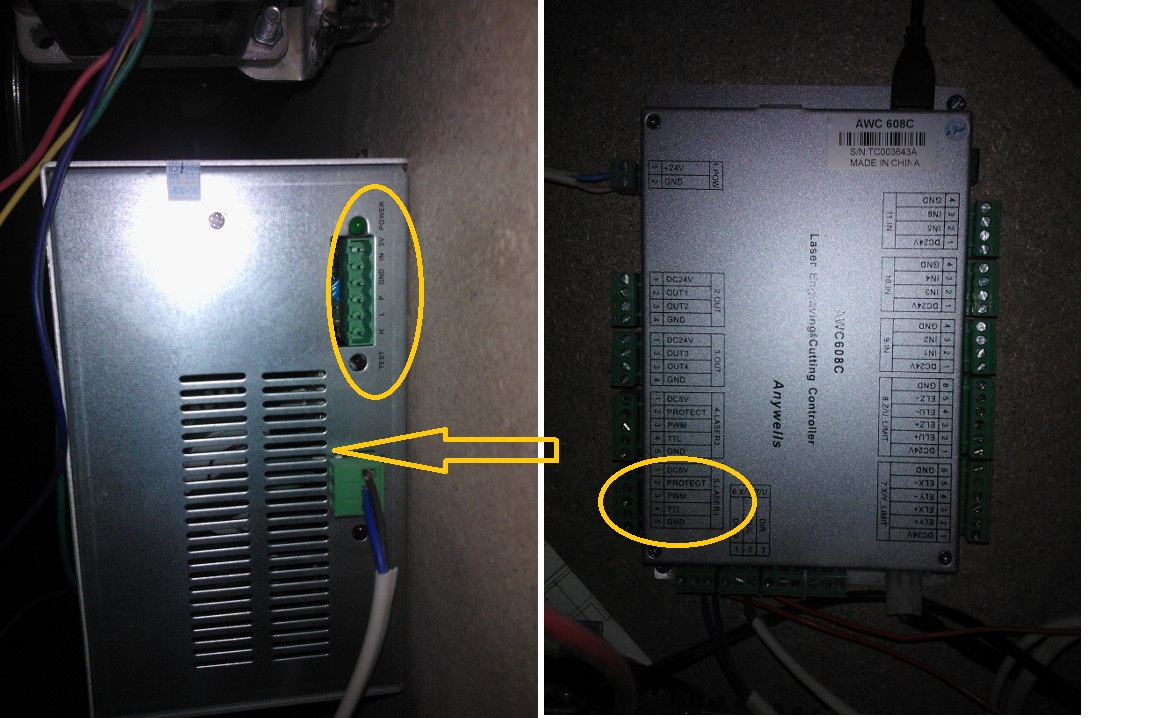 Добрый вечер помогите пожалуйста подключить контроллер( AWC608C ) с блоком питания лазера