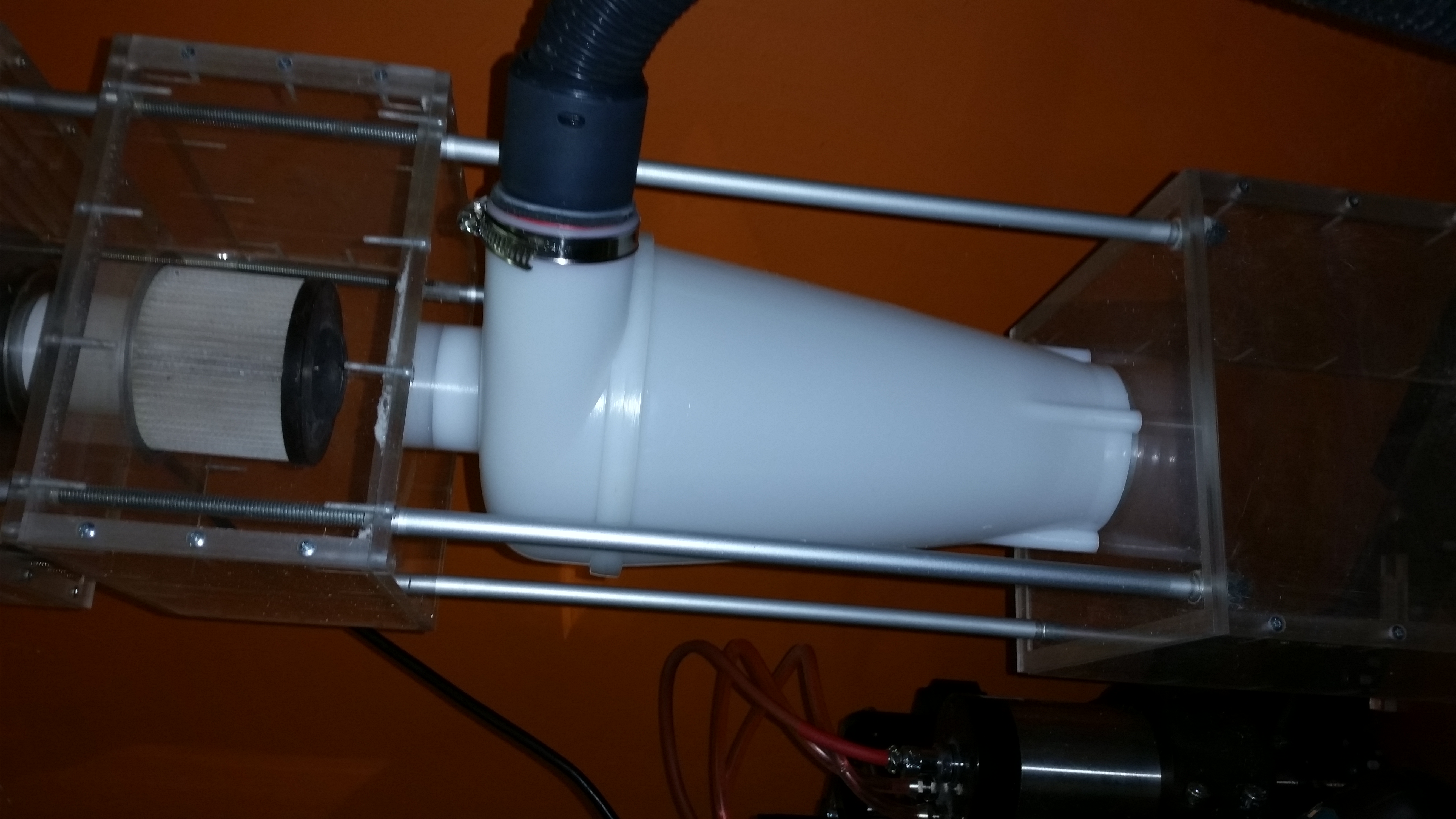 Может надо будет переделать эту штуку под фильтр у которого высота меньше, а диаметр больше? И, тогда, использовать его именно так - наеборот. Но бытовые фильтры, что я в руках держал/менял - все снаружи "грязные", а внутри "чистые". Кроме того, все привязано к улитке китайской с гордым названием "Циклон". Я, когда ее тестировал присовывал ей сосало от промпылесоса. Так вот, если из-за угла сосать - то она свистит, а напрямую, как сейчас сделано - нет. Может это из-за того, что вся конструкция была собрана на изоленте?