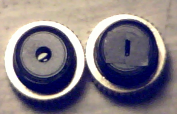 Дальше продолжил эксперименты - заменил круглую диафрагму на щелевую (попросту наклеил на ту шайбу две полоски черной изоленты, так, чтобы получилась щель шириной около 1 мм, перпендикулярная цилиндрам линзы. Ширина полоски в результате стала меньше 0,5 мм. Примерно так.