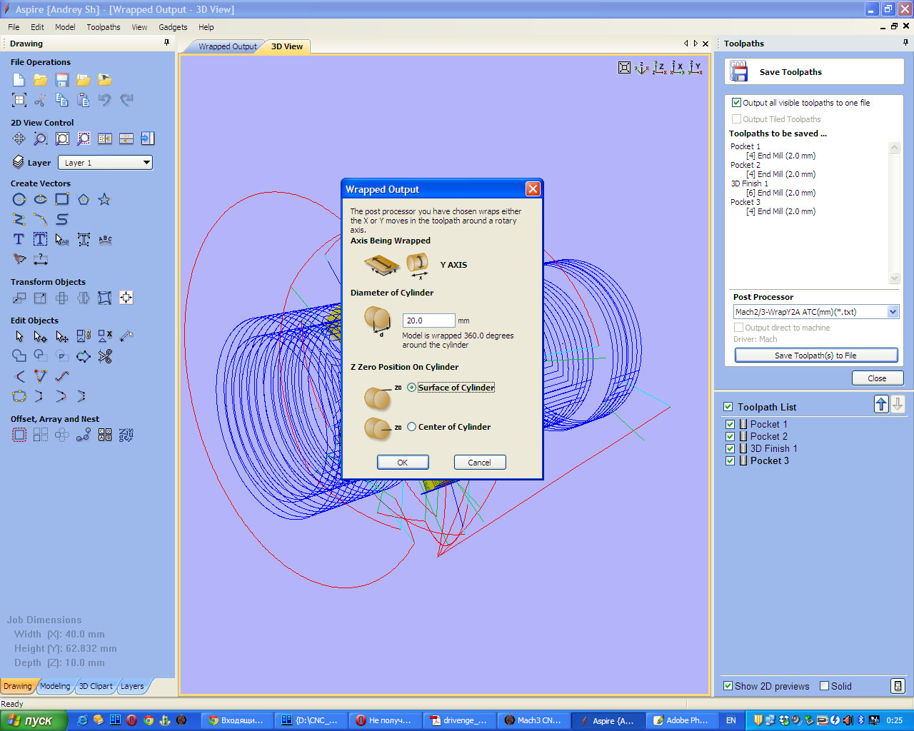 Prinkos писал(а):Делаю УП, в программе вроде видно, что идет обработка по оси. Сохраняю в формате Mach2 (*.cnc*) или в формате для Mach3 (*.tap) - никаких намеков на вращение - обычная развертка