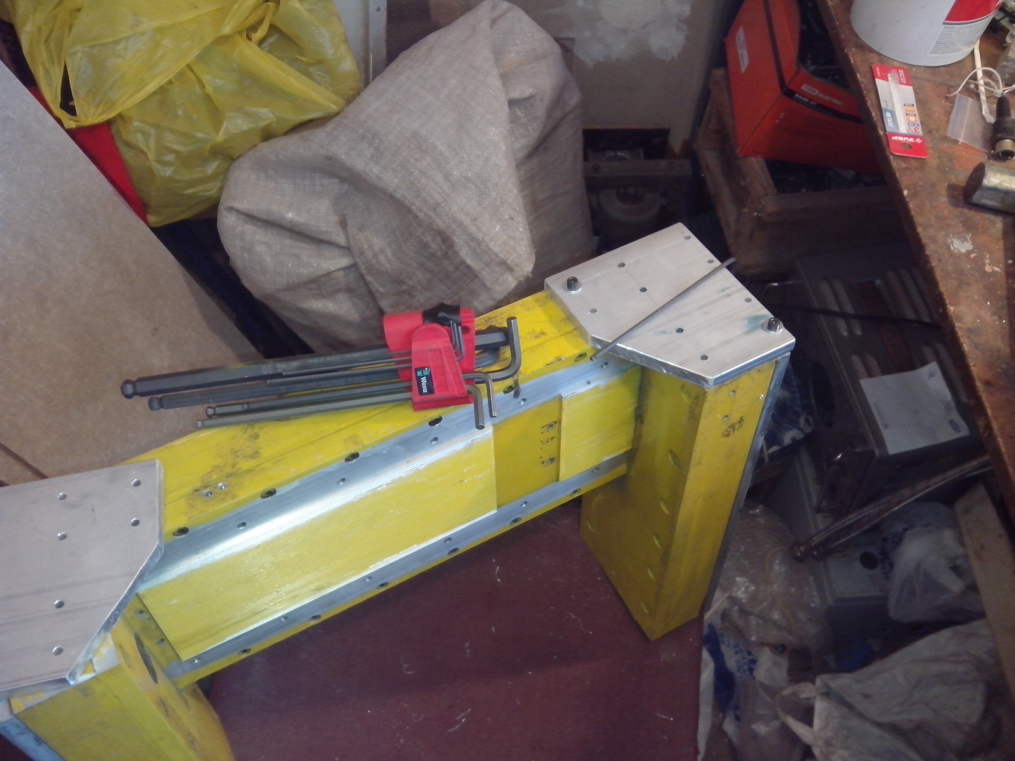 Заполнил полость ног портала композитом. Тепреь вместо "дзинь" при постукивании металлическим предметом оно глухо говорить "тук" :) Также из остатков плиты 10мм толщиной получились косынки, которые замыкают профиль сверху.