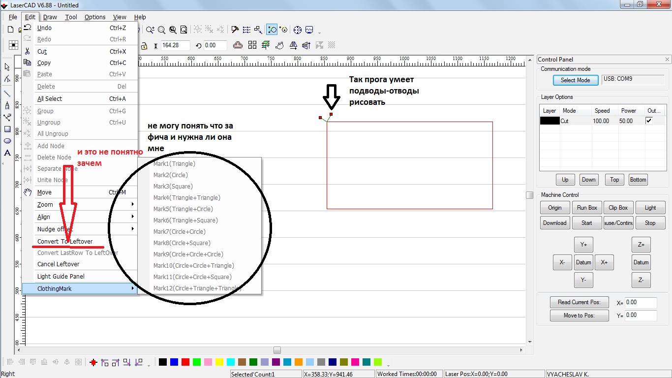 Такая Фича в Лазеркаде есть ,но без временной задержки .... т. е вариант не прокатит. Можно конечно всяко разных мелких кружков понарисовать дополнительно в местах врезания ,но это время дополнительно тратить.......... Ну или еще более подробно прогу изучать -вроде перерыл её и вдоль и поперек . Единственное что не понял вот эти пункты менюшки ,даже активировать их каким либо способом не удалось