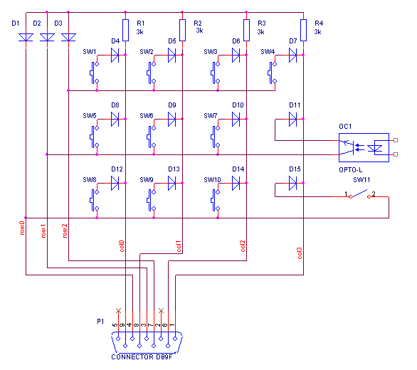 Схема клавиатуры содержит 12 нормально разомкнутых кнопок, включенных в матрицу 3х4, 5-6 маломощных диодов (например КД521 или 1N4148) и 4 резистора на 3-6 кОм. Подключается семипроводным кабелем или шлейфом.