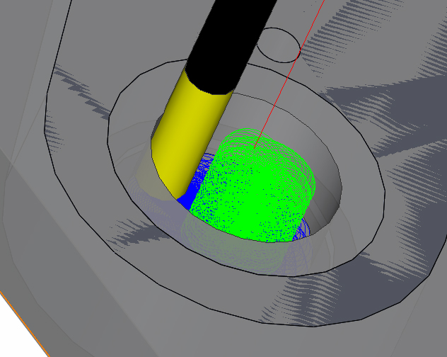 На фото видны 2 точки траектории (красная стрелка), обычно в такой точке спускается фреза, но сами видите где она начинает обработку.