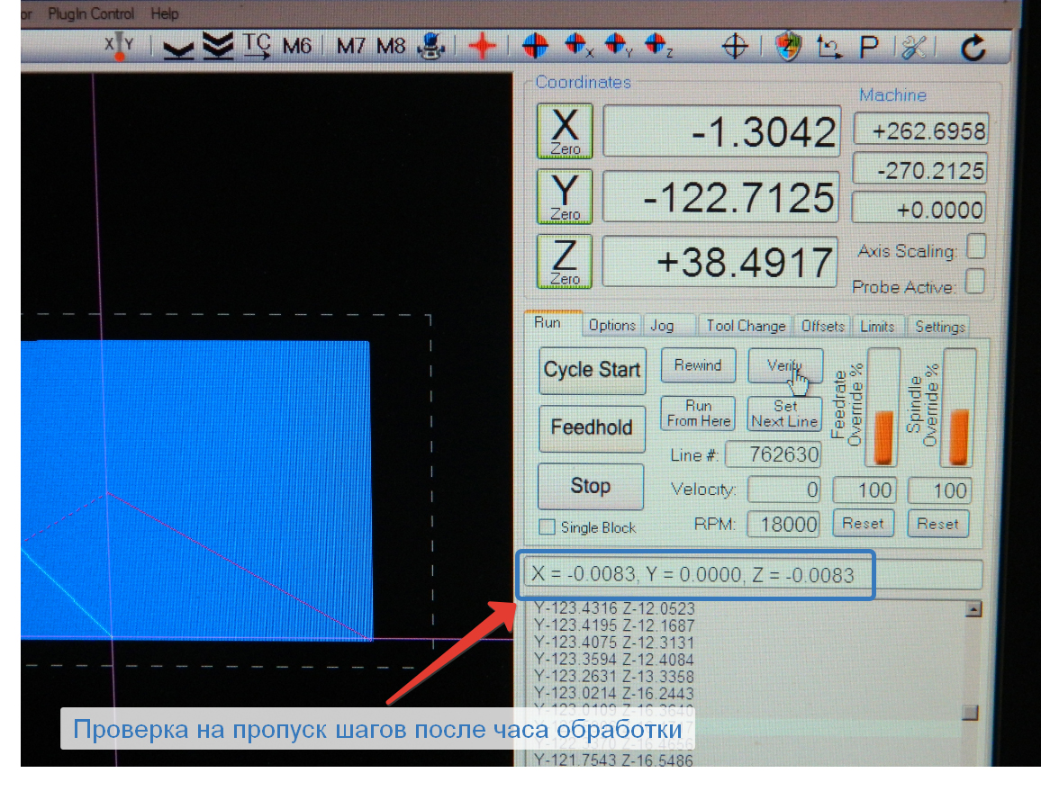 Щиты 550x300x35. Решил резать насыщенное рельефом панно. До этого резал небольшое размерами 120x80. Режем в Ncstudio 5.5.60. Уже же не первый раз. Сначала черновая 6мм фреза 3 часа 8 минут. Никаких проблем не возникло. Может мяса где и мало сняло, но в сторону не уводило. На следующий день чистовая. Едем чистовую. Через минут 40-50 станок по случаю наезда осью Y на лимит остановился. Смотрю, а рельеф плавно уполз по Y в сторону концевого датчика (то-то и остановился). Судорожно пытаясь спасти заготовку через Jigle потихоньку возвращаю назад. Через некоторое время - снова уползает да еще и углубляется по Z. На фото видно, что пропилил насквозь, хотя по траекториям до стола должно оставаться 5мм. Поняв, что заготовку не спасти начинаю мучить разными траекториями (пытаюсь обработать рамку отдельно). Короче все ерунда. Делал метки маркером на валах и муфтах с целью засечь не пробуксовывает ли муфта. Все нормально. На слух тоже пропусков не было. А вот с добавлением шагов не знаю. Меняю Ncstudio на Mach3 (делов 1 минута). Сохраняю траекторию постпроцессором для Mach3 и начинаю резать с середины. Через один час вырубаю из за отсутствия косяков. Никаких проблем! Скорости и ускорения в обеих программах одинаковы. В Mach3 даже чуть повыше. А в Ncstudio пробовал снижать. Все равно прет в бок.