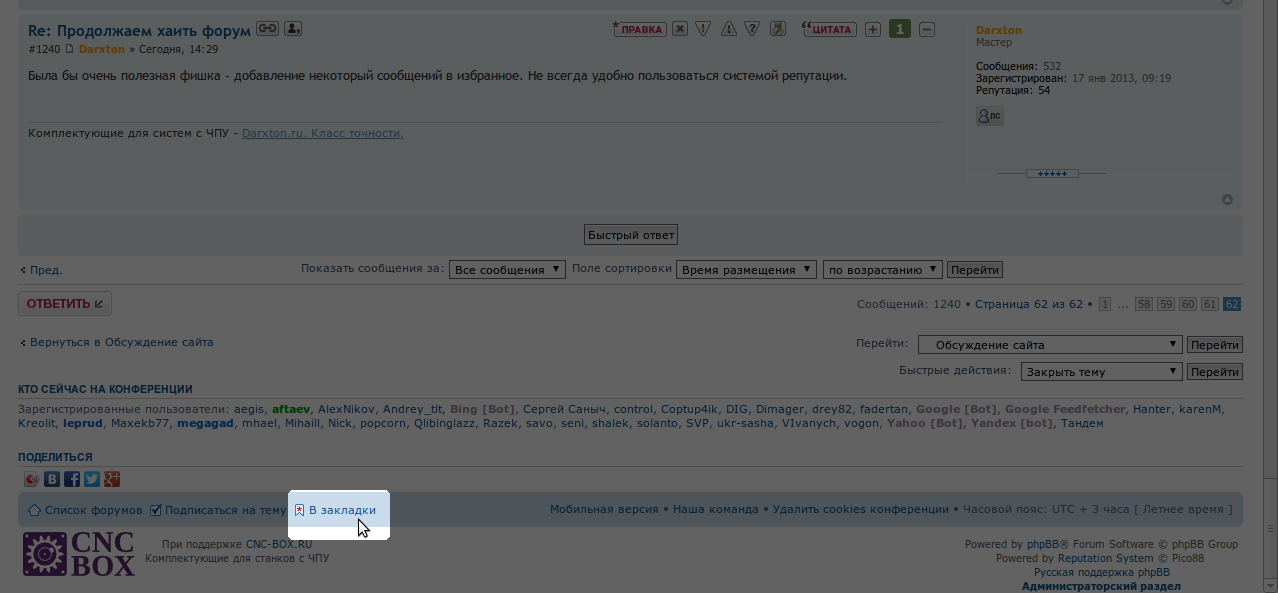 Darxton писал(а):Была бы очень полезная фишка - добавление некоторый сообщений в избранное. Не всегда удобно пользоваться системой репутации.