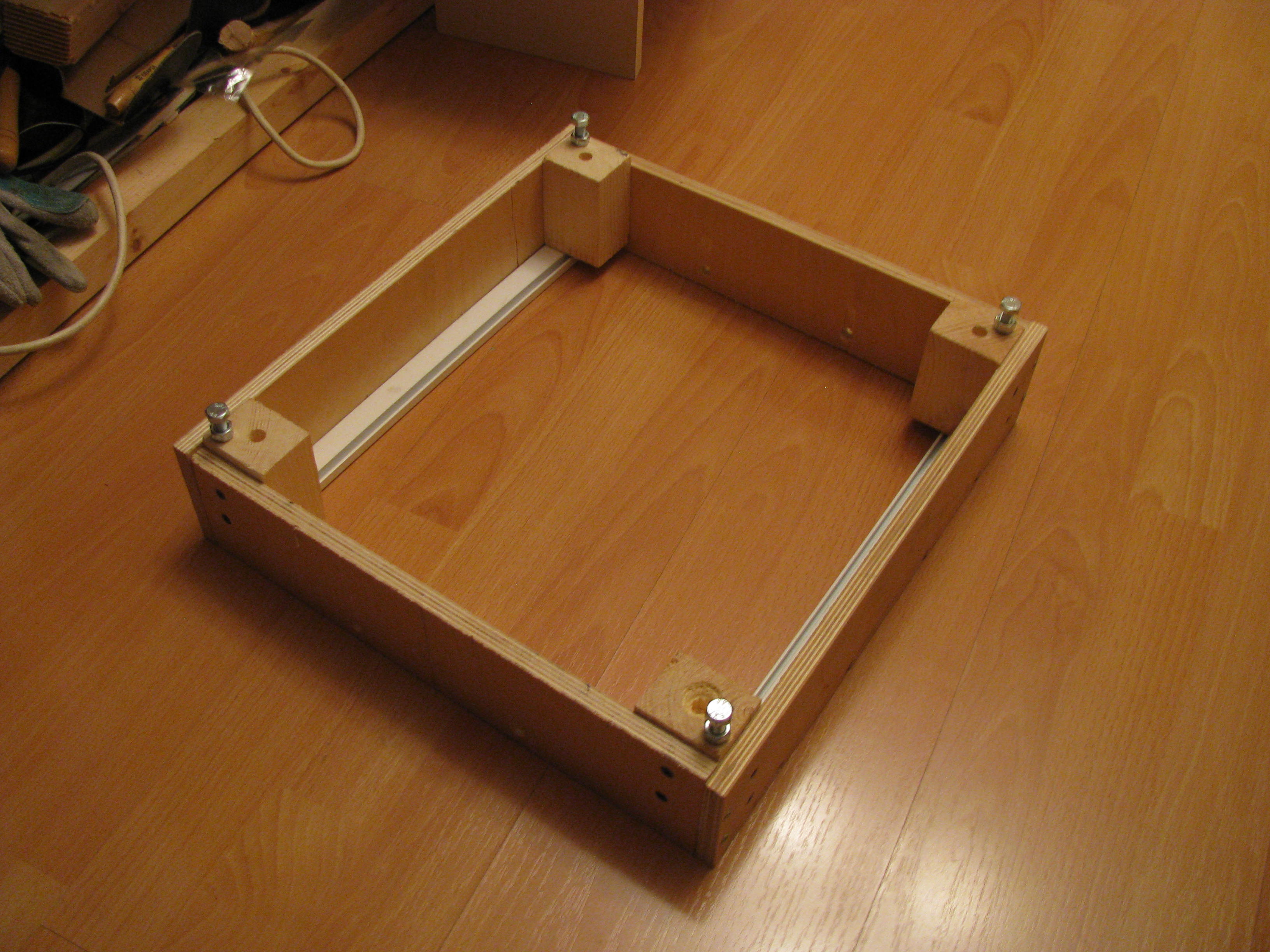 Пока что все криво, позже буду выравнивать по уровню, по углам поставлю бруски 4*5см и воткну в них регулировочные винты. Жесткость конструкции будет обеспечивать алюминиевый профиль.