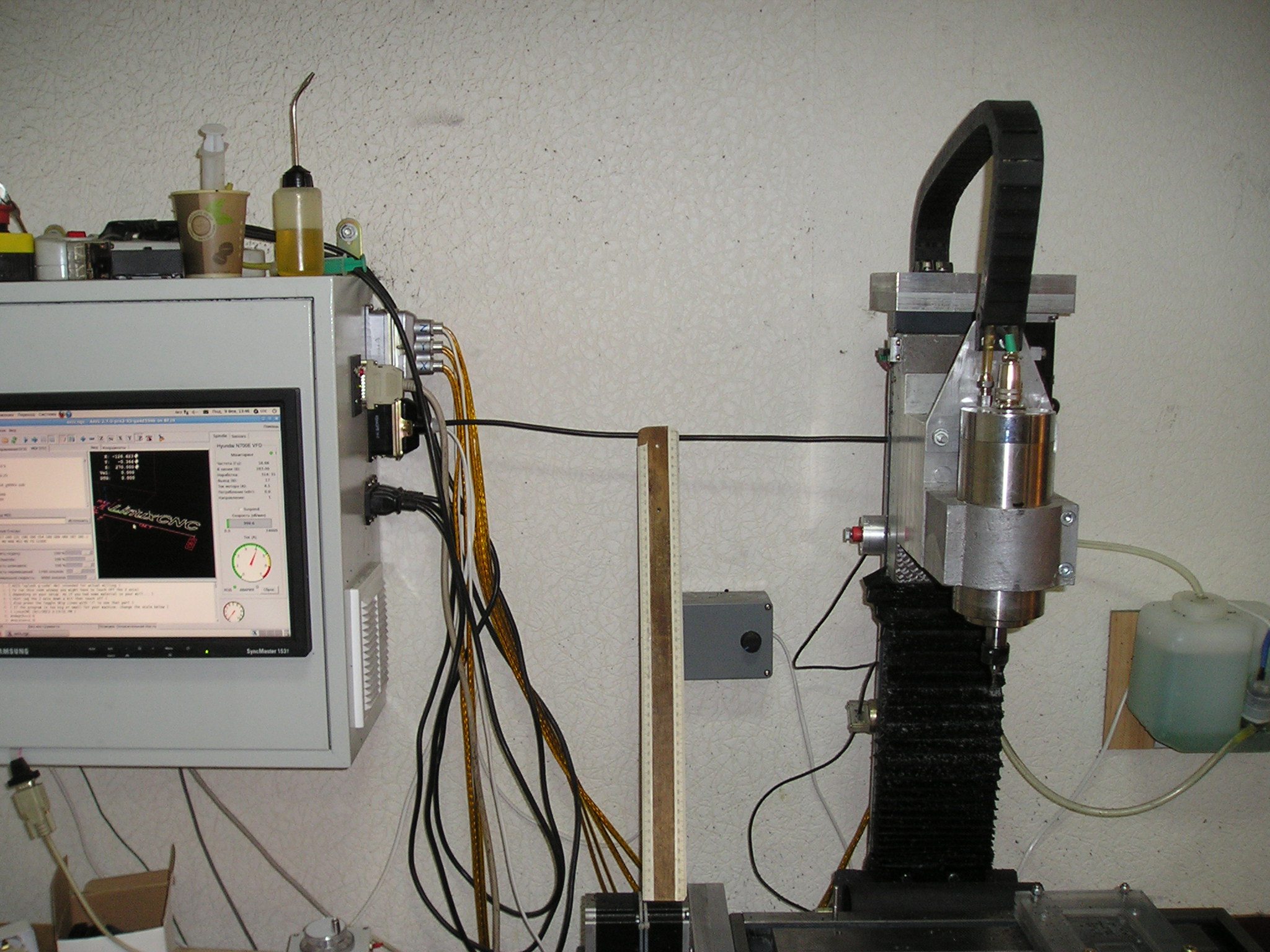 - станок с китайским мотор-шпинделем 1,5кВт - с корейским частотником, который, собственно, и будет излучать помехи, а мы с ними бороться. Для удобства и наглядности кабель идущий от частотника к шпинделю натянут и к нему приставлена линейка. Деревянная, чтоб не вносить искажения в картину поля. По расстоянию от кабеля, на котором срабатывает индикатор, будем судить о напряженности поля.