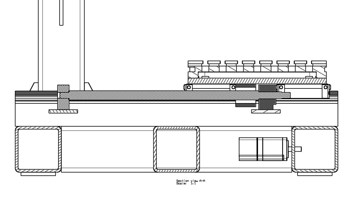 Ось шпинделя будет проходить по центру конструкции (грубо, по центру трубы внизу рисунка), как видно, стол перебегает эту линию в обоих направлениях