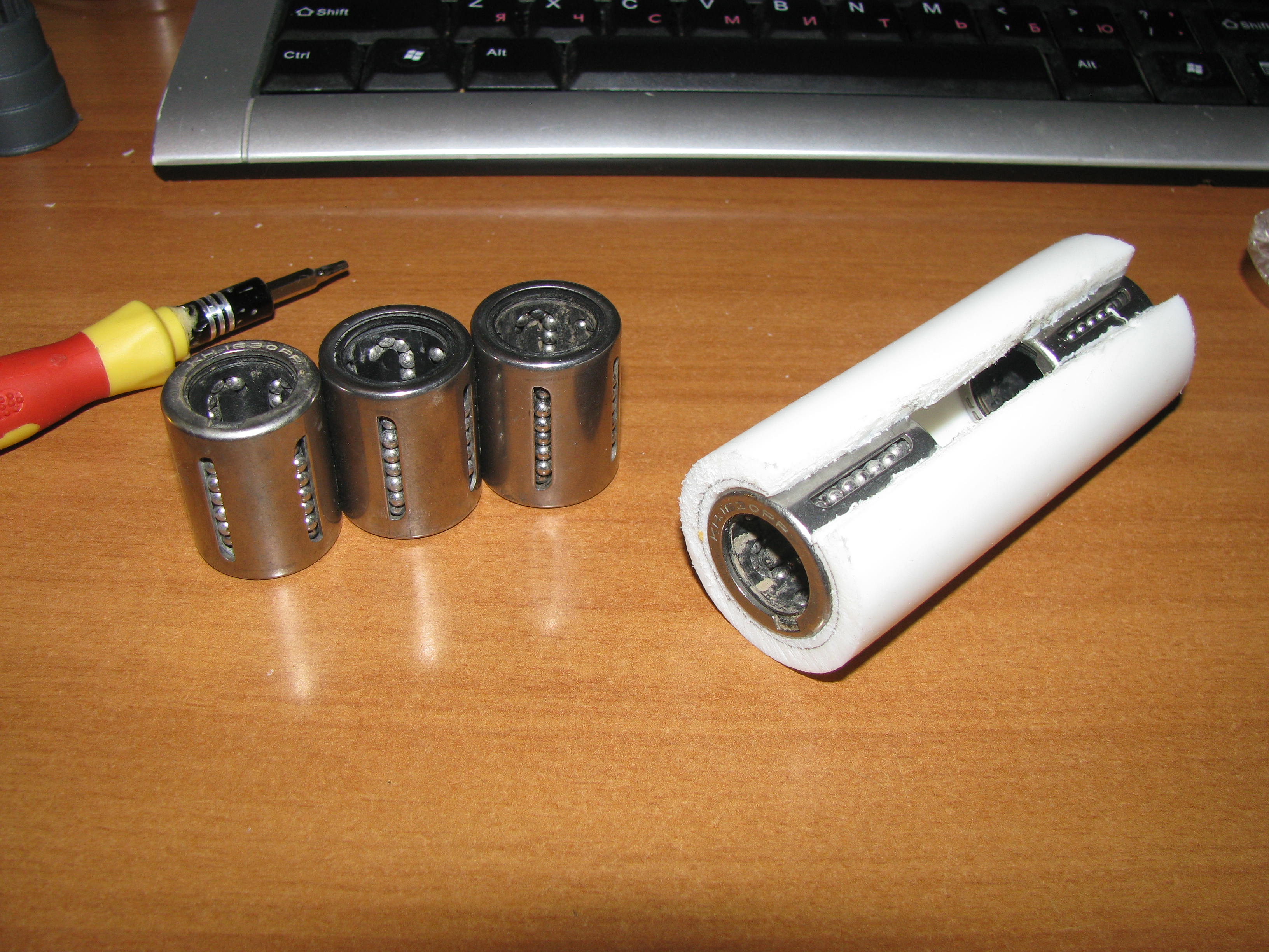 Пластиковые крепления для ПВХ труб поставить не получится, места впритык, 1-2мм до каретки. Рассматриваю вариант с металлическими хомутами, прикрутить хомут саморезами к каретке и зажать в них трубку с подшипниками. Но что-то тревожит вопрос, от такого большого давления на них со всех сторон, не деформируются ли линейные подшипники? Они как-то хрупко выглядят...