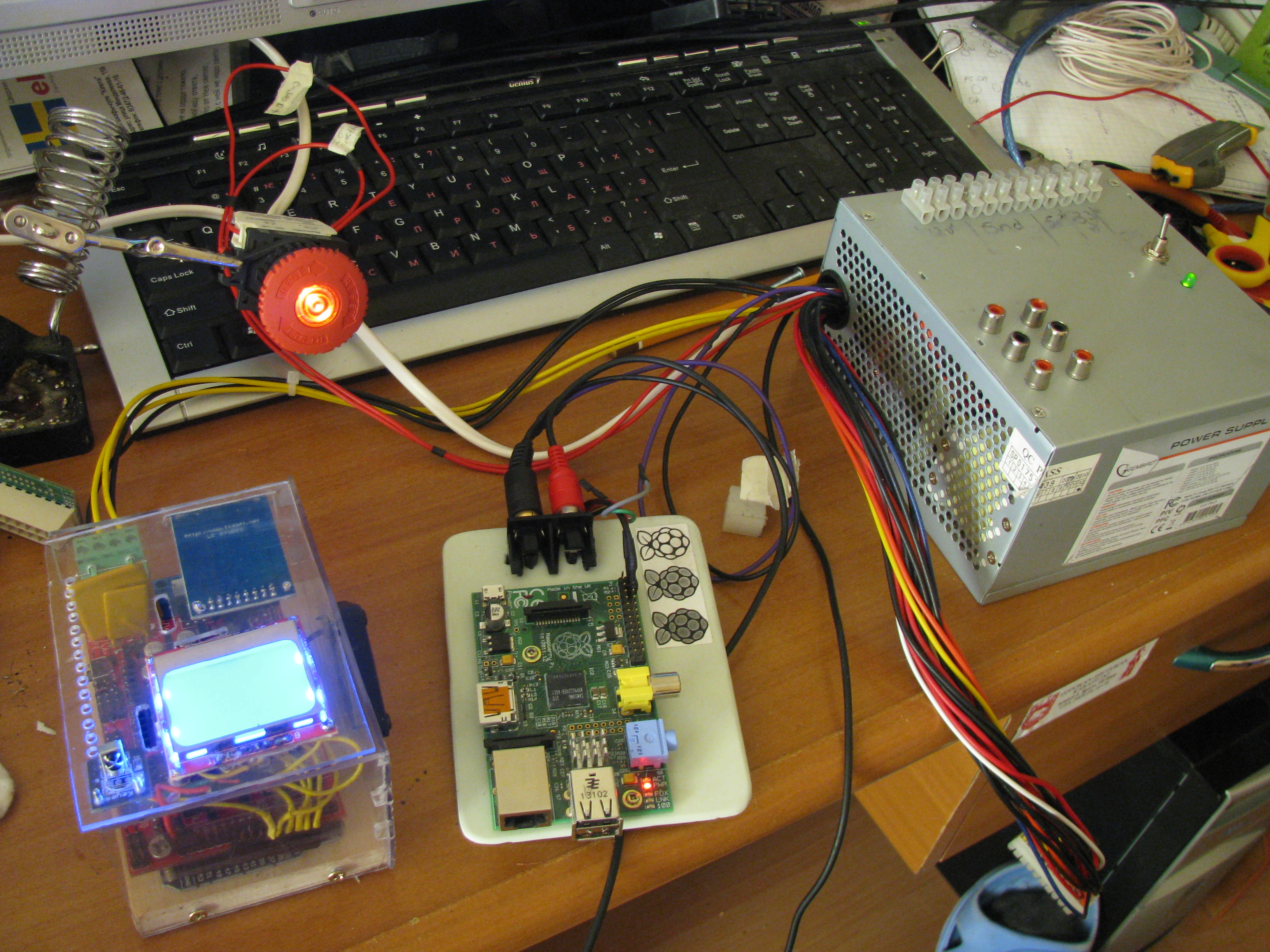 Я развел так, что на Raspberry Pi питание подается всегда от 5vSB, к нему же подведены и PS_ON с PW-OK, позже их подключу. Все выключатели, в том числе на корпусе БП идут сразу после E-Stop, так что его нажатие отрубает БП полностью, не задевая резервную линию - 5vSB. Светодиод в кнопке питается от 220V на входе БП. На корпусе БП надежно закреплена земля, внутри тюльпанов в верхнем ряду 12V, средний ряд 5V и нижний 3V, позже еще наклею надписи :)
