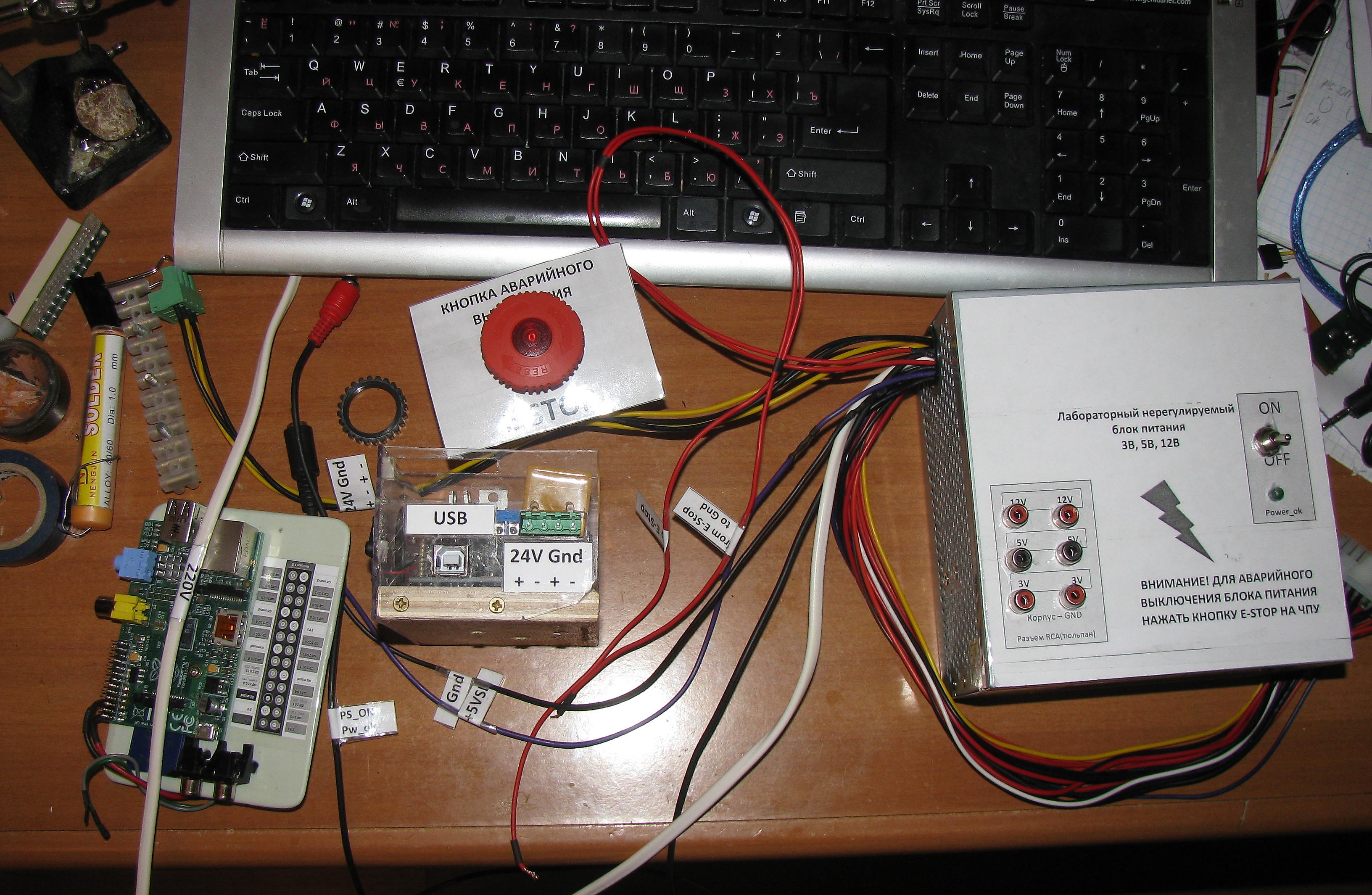 Налепил на монтажный скотч разных бумажек на провода и БП, чтоб не запутаться. Завтра буду E-Stop на станке крепить.