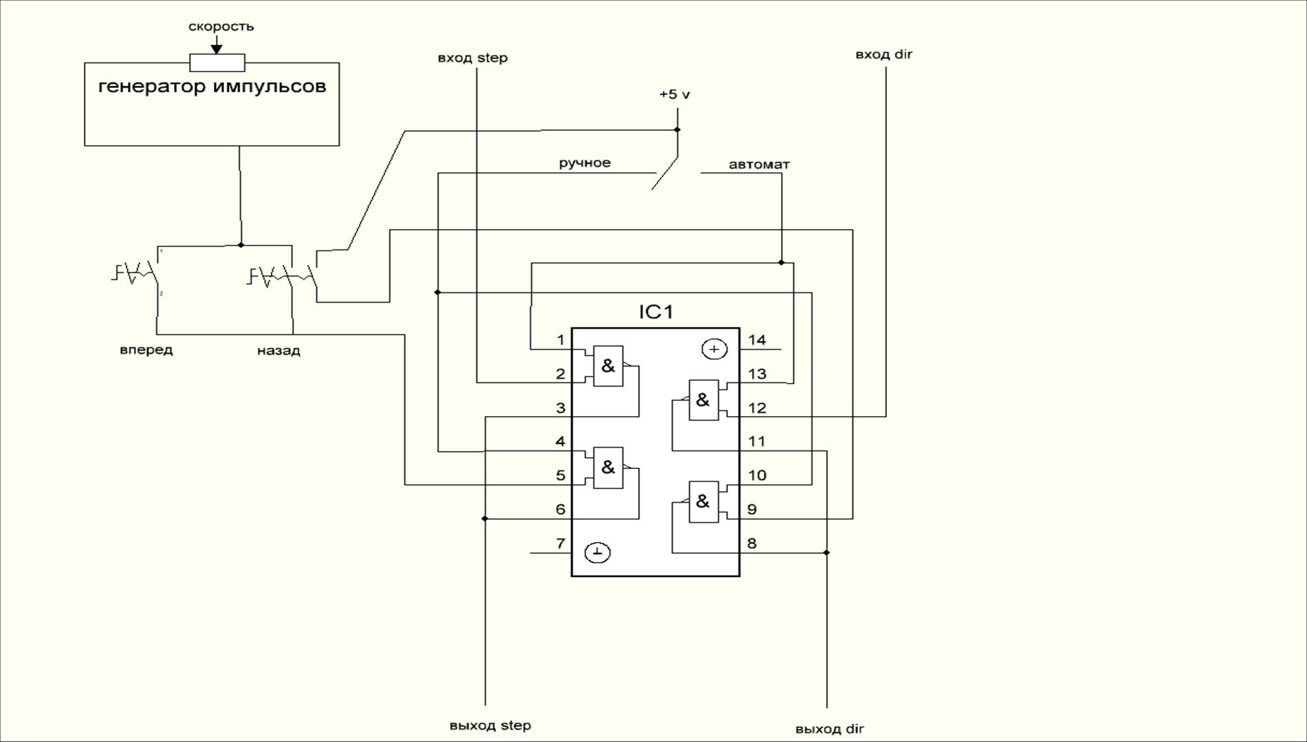 Набросал небольшую схемку пульта на ттл-логике, который должен работать и без компа. Блок будет иметь два разъема под LPT(вход-выход) и питание 5 вольт! Выход с порта компа подключается к блоку, а выход блока к контроллеру. на блоке управления имеется(будет иметься) переключатель с ручного в автомат На каждый канал идет одна микросхема к155ли1.
