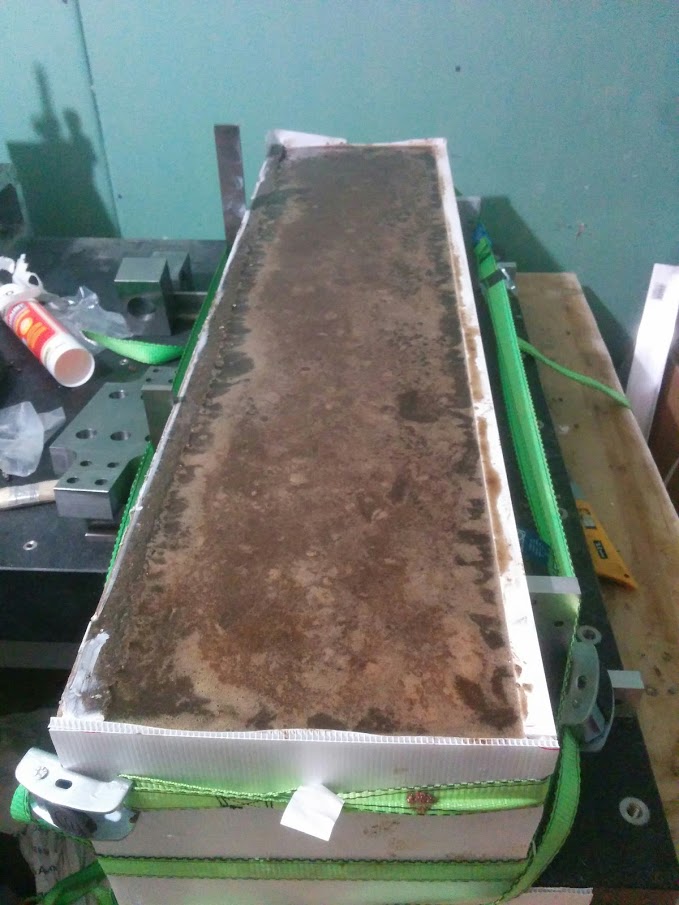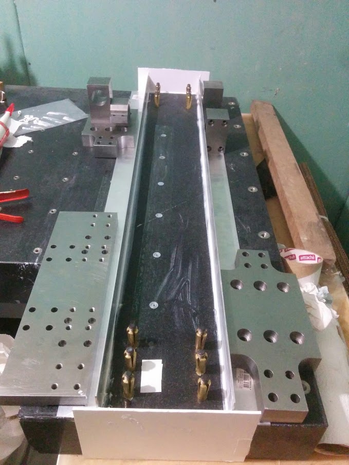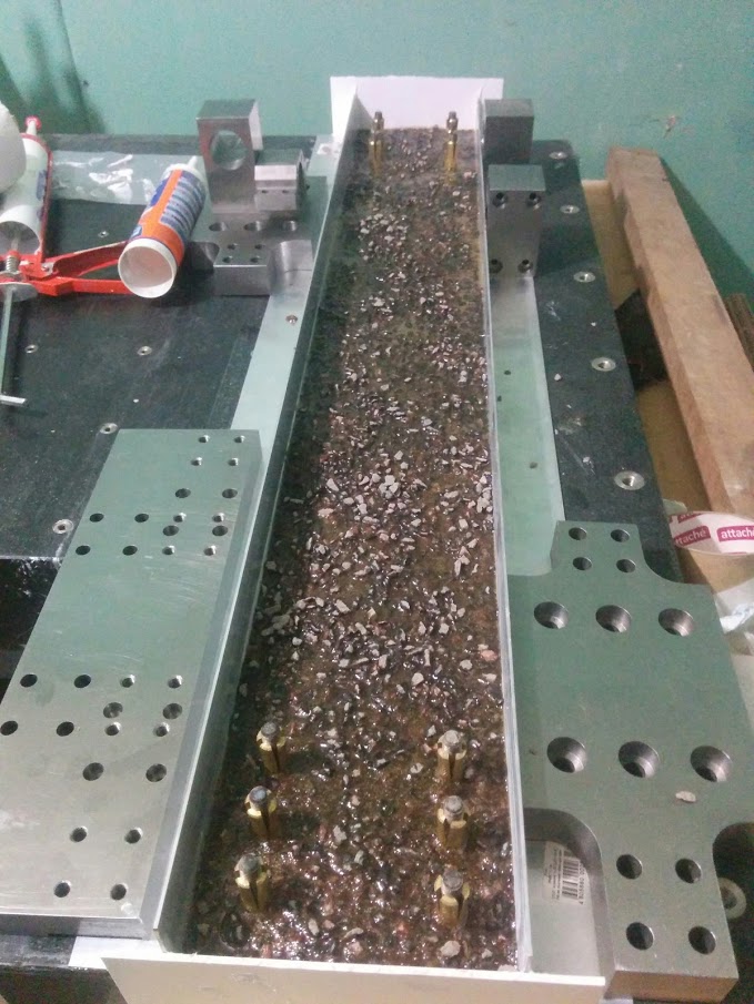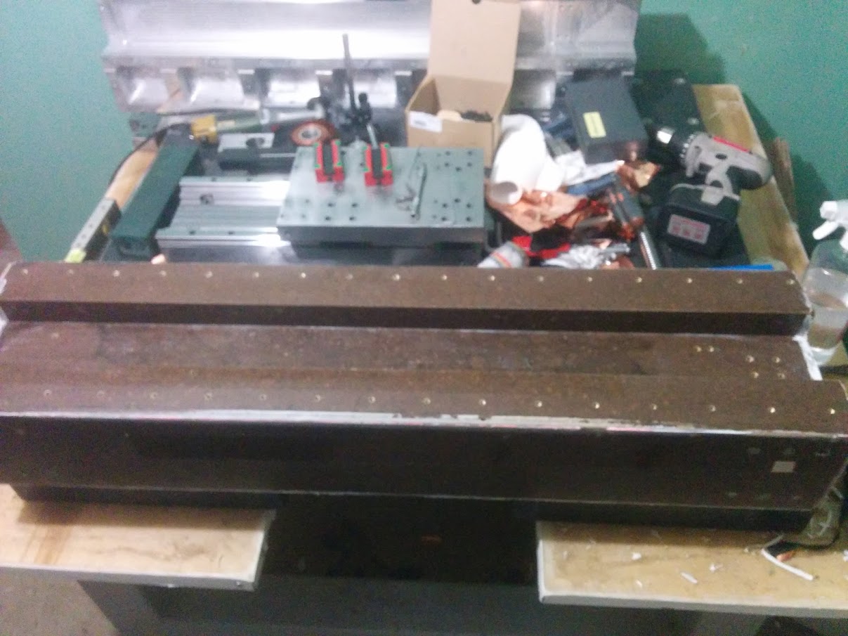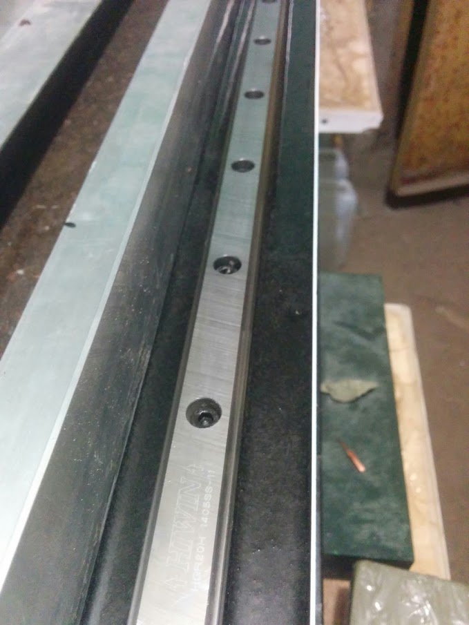 Также расставляем по шаблону закладные, и ставим люминиевую трубу 100*40, которая нам сформирует нишу под винт ШВП. Сначала заливаем первый тонкий слой пожиже, чтоб при заливке основной массы не сдвинуть закладные, даем подвстать сутки, и заливаем все остальное. Опять недельку отлежаться, после этого снимаем всю опалубку и отрываем балку от плиты. Оторвалась надо сказать довольно легко. Ставим рельсы, жутко материмся выставляя их без упорного буртика. После токо как выставили их по индикатору по обоих осям и параллельности, формируем упорный буртик из смолы и молотого углеволокна: Чего еще сделано... куплено практически все, кабель каналы, все провода, шкаф, система ЧПУ, вся пневма, концевики, куча конусов, фрез и т.д. Выставил и собрал полностью ось Z, фото позже, когда буду пересобирать все на локтайт. Появилось кучка свободного времени, так теперь сборка пойдет более быстрыми темпами, надеюсь к сентябрю получить первую стружку.
