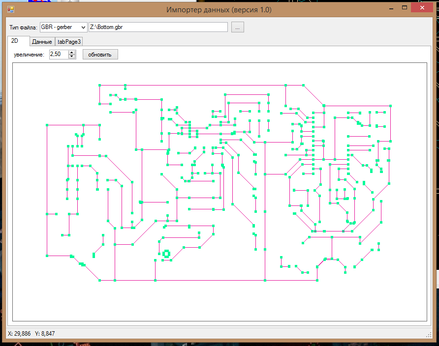 Появилось немного времени, и сделал загрузку данных из формата GRB, g-код конечно пока ещё не придумал как генерировать, но вот чего добился: