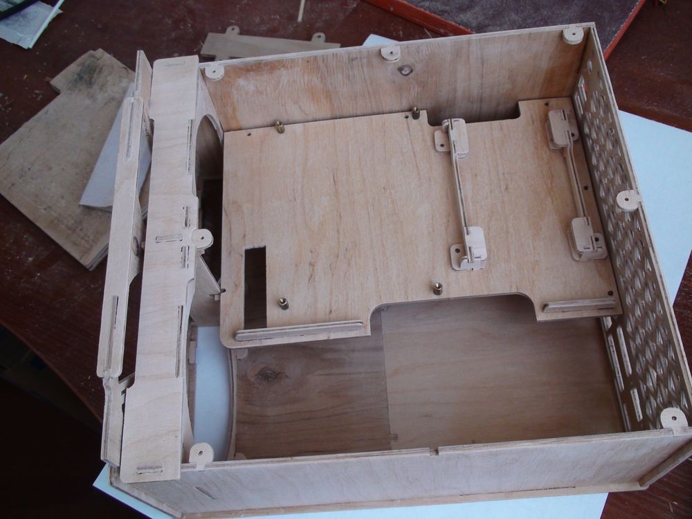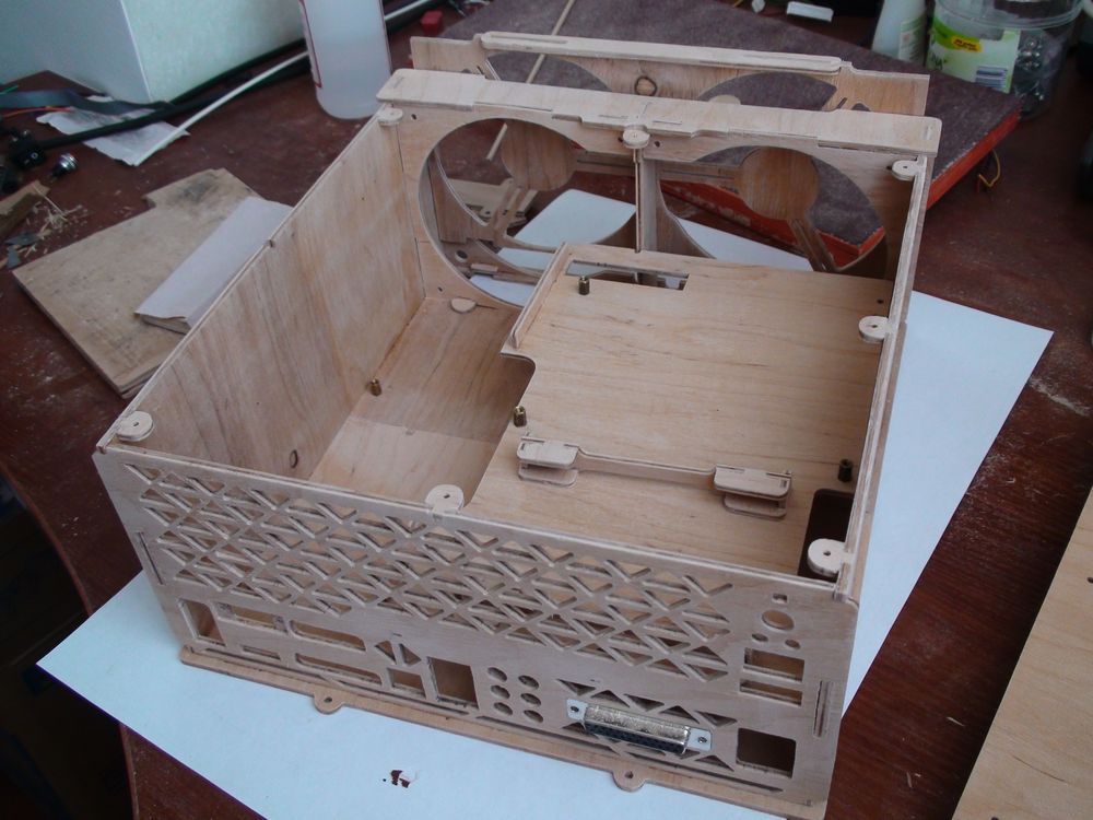 Продолжаю потихоньку ковыряться со станком, первоначальная идея что он будет стоять на полу рядом с основным компом, а сам буду лежать рядом с ним быстро лишила меня энтузиазма на этот счет, путем долгих мысленных усилий было решено обзавестись отдельным рабочим местом, ну чтоб как у людей, ага :) Как раз подвернулся донор на роль управляющего компа, кое-что выбросил из него, кое-что поменял, вроде заработал, сижу смотрю на это гнездо со змеями, понимаю что надо бы запихать все это дело в какую-то корпусяку, но все корпусяки какие-то большие попадаются, а хотелось бы что-то компактное, желательно чтобы под столешницей поместилось, и ногами не сильно задевалось. Долго пытался найти что-то подходящее из готового, но удача не хотела улыбаться. После очередного мозгового штурма было принято волевое решение запилить этот самый корпус, вроде ничего сложного, ну да, пока не начнешь делать :) Вообщем несколько дней рисования в каде, пару-тройку дней на запиливание и еще несколько на склейку/покраску/сборку. Вот что получилось: