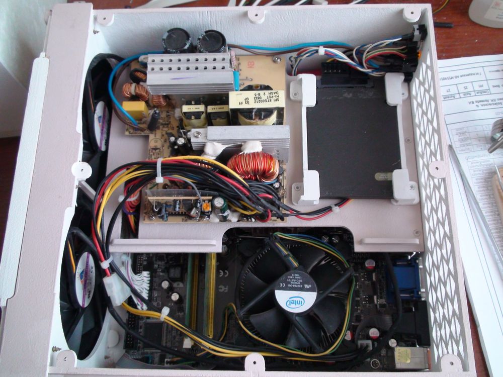 БП, судя по размерам - обычный АТХ без железки и вентилятора. ХДД ноутбучный с такими-же стандартными отверстиями крепежа.