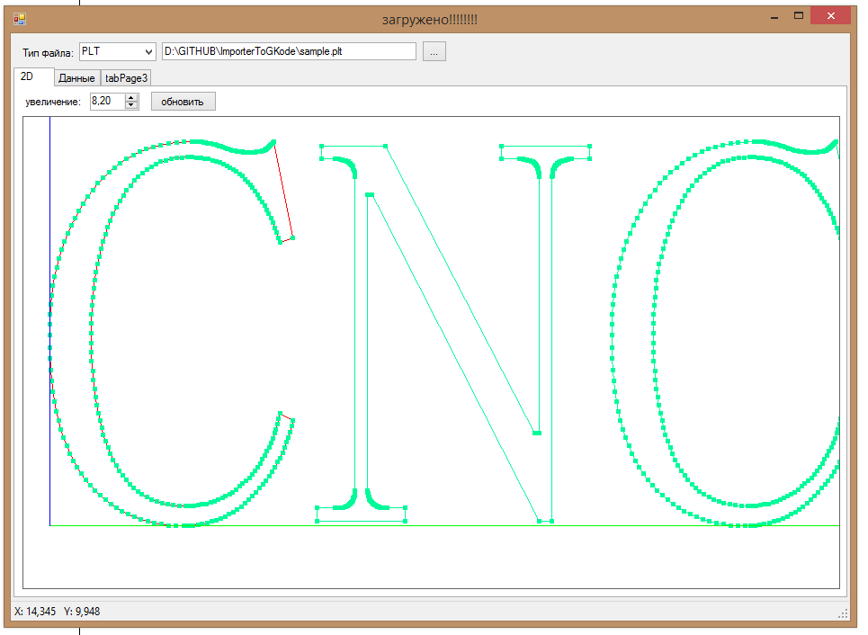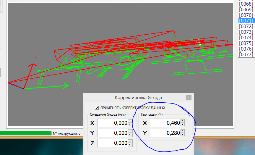 1) Выполнять только выделленый список кодов: 2) Добавил управление с помощью мышки: 3) Добавил маштабирование выполняемого кода, когда нужно выполнить гравировку, в определенной области, (правда это отхождение от правил того как сделано в других программах... :-) ) 4) Добавил и проверил гравироку на детали закрепленной не горизонтально: