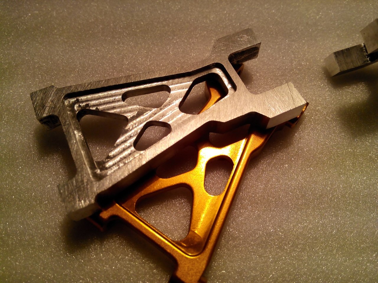 Вот первые пробные детальки. Натупил с переворачиванием, есть смещение на одной стороне. По длине детальки 50мм, толщина 5мм, фрезы копеечные базарные. Обороты 4770, подача на зуб 0,01мм, заглубление 0,5мм.