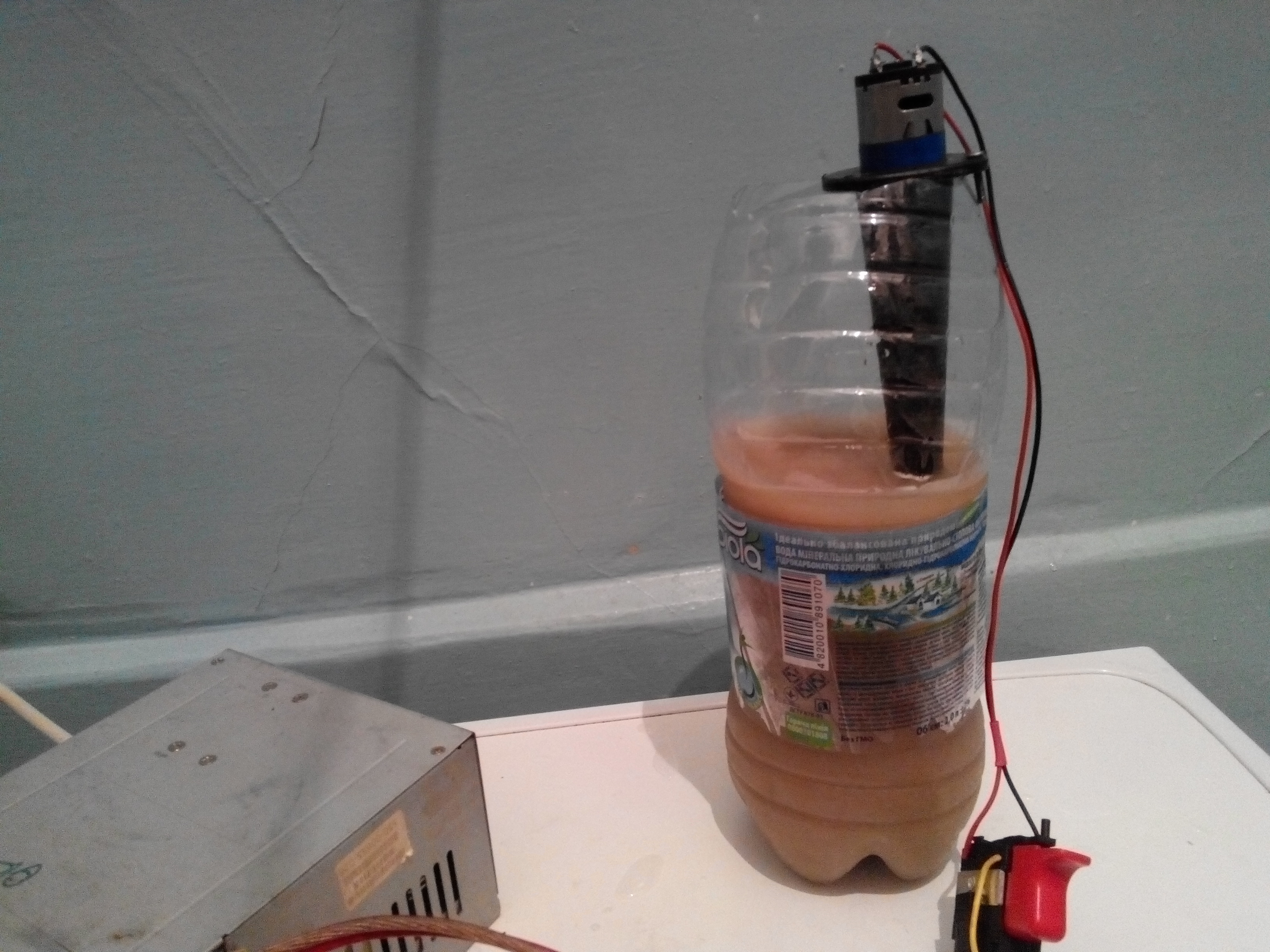 Минут 15 гоняет жижу по бутылке на полной мощности, двигатель теплый, остальная электроника холодная. В качестве подобия СОЖа - вода и немного отработки. Насос всколотил сразу до такого состояния: