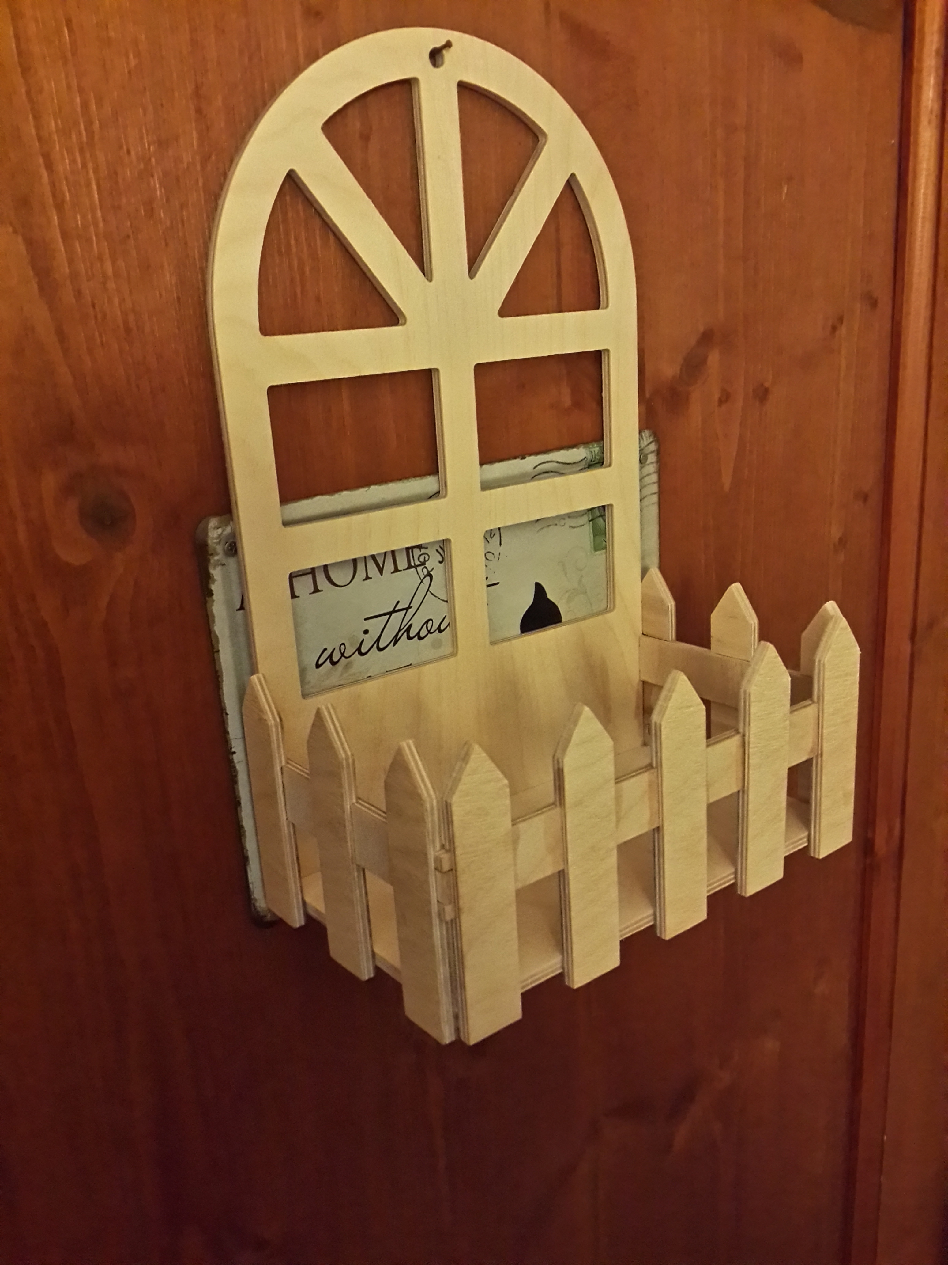 Это тоже банальность, но мне понравилось как она смотрится, да и размер у нее получился более впечатляющий, чем я ожидал. Вырезана из 4-мм фанеры. Есть файлы для VCarve, подготовленные для этой фанеры. Что бы не дорабатывать внутренние углы напильником, наделал в VCarve в углах вырезы (Fillets). Фанеру после резания слегка отшлифовал шкуркой и прогрунтовал. Жена довольна