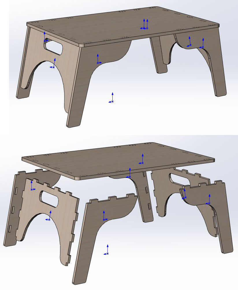 Столешница и ножки - фанера 8 мм, боковины - фанера 6 мм. Приложил солидовские файлы (SolidWorks 2012), из них легко выгнать .dxf для того же Вектрика