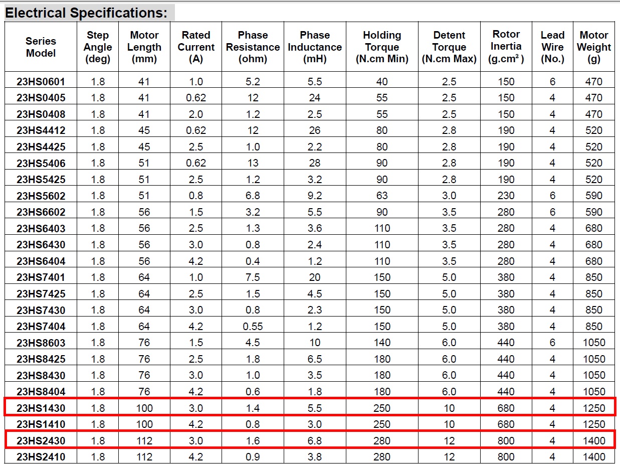 Один мотор из таблички - 23HS9430, странно выделяется из общего ряда характеристиками: 3 А и 1.8 mH при тех же 48 V и 400 шагах - это 11.1 оборотов в секунду, более 3 метров в минуту.