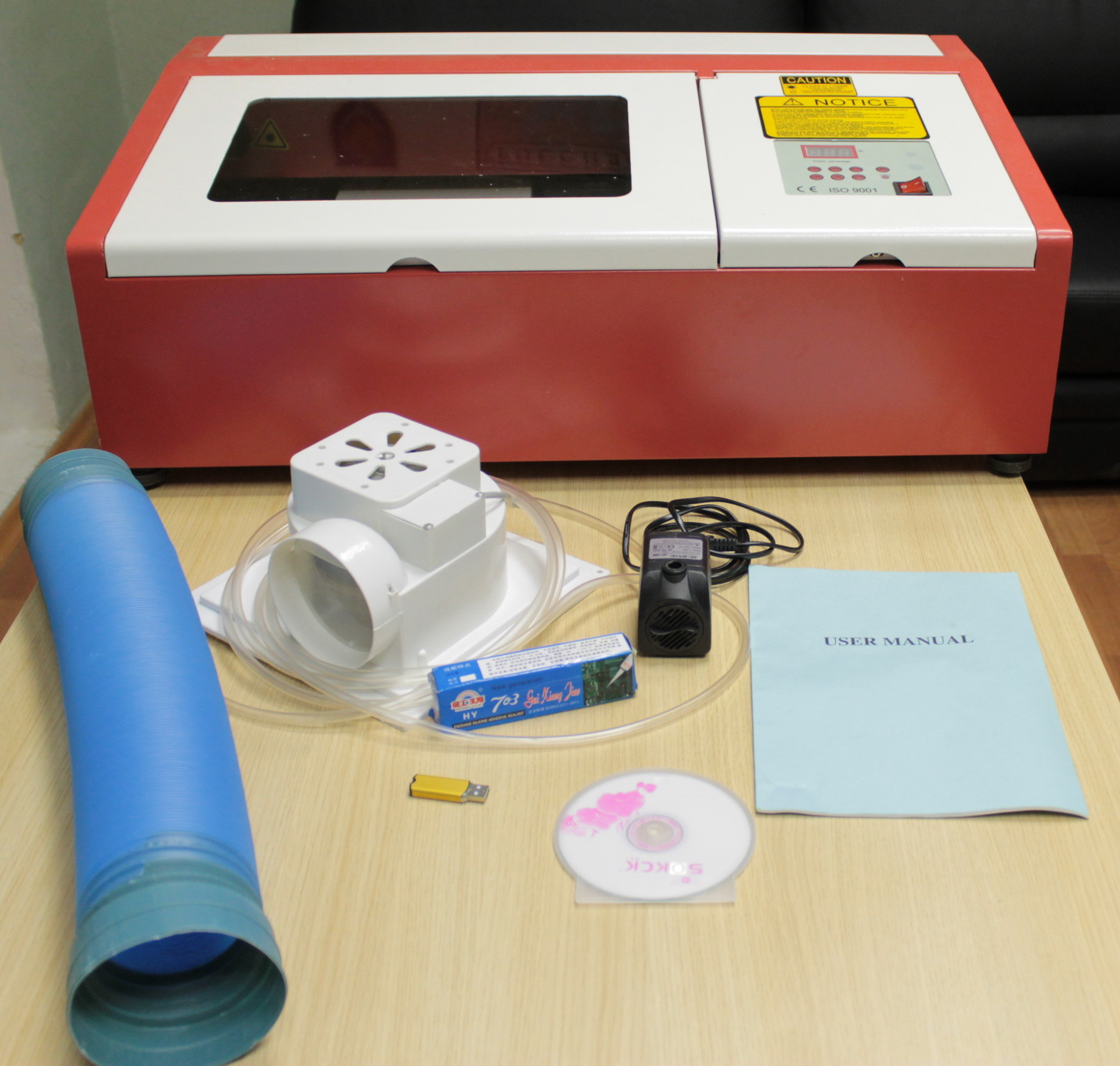 В комплекте диск с ПО, патрубок с вентилятором для вытяжки, флешка-ключ для ПО, помпа для системы охлаждения лазера.