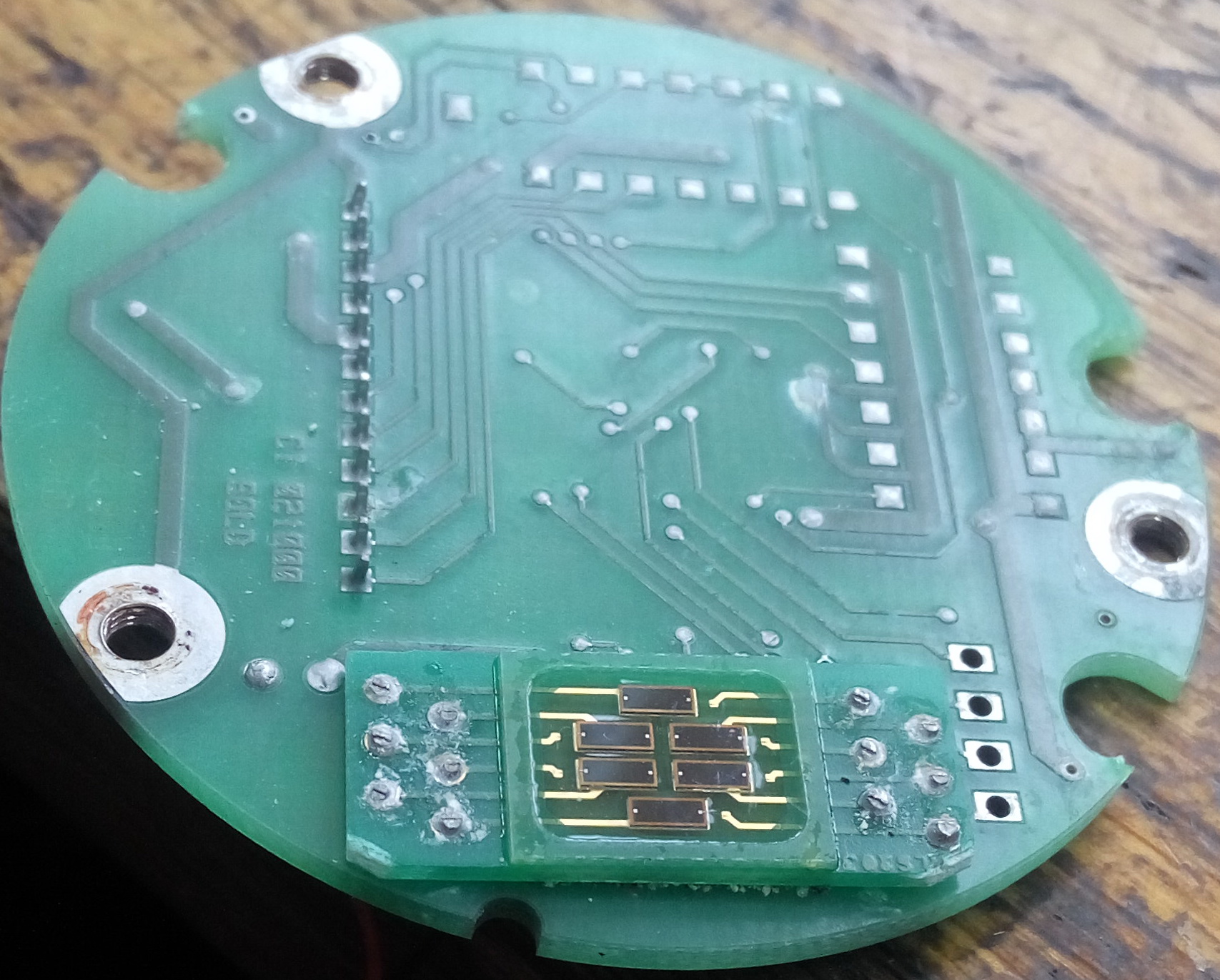 Под стеклом виден осветитель. Он светит через диск на матрицу фотоэлементов, которые считывают метки. При ударе вал сместился в осевом направлении и при вращении часть меток стерлась о компаунд, которым залита матрица :( Поэтому точная конфигурация на фото не видна...