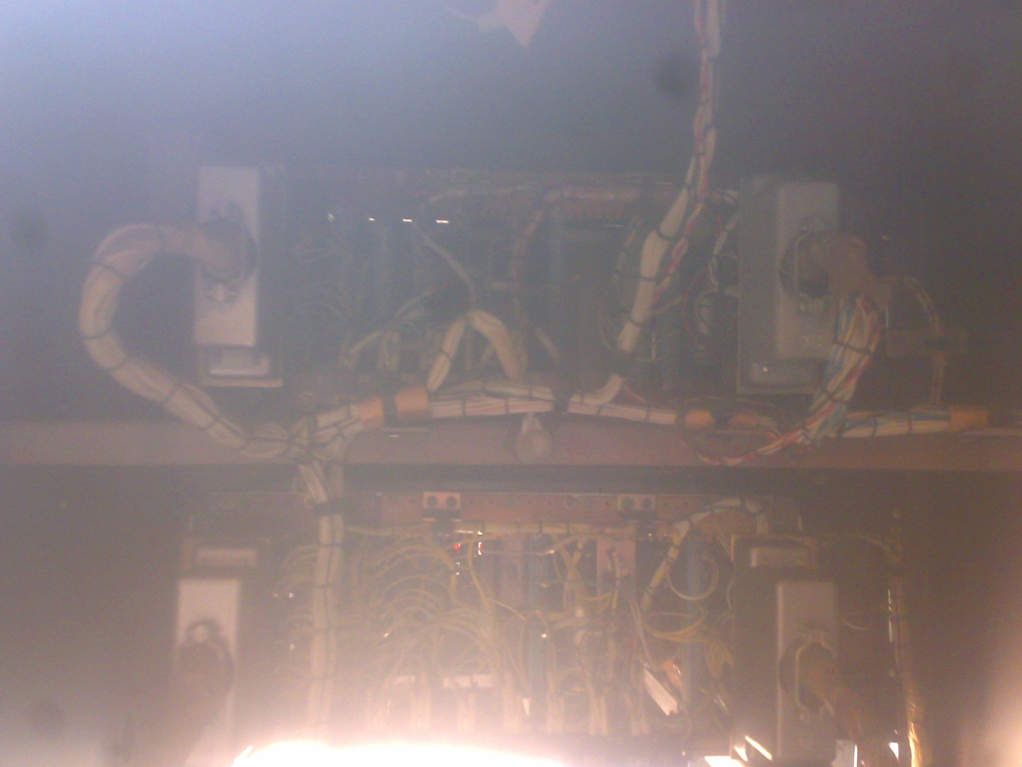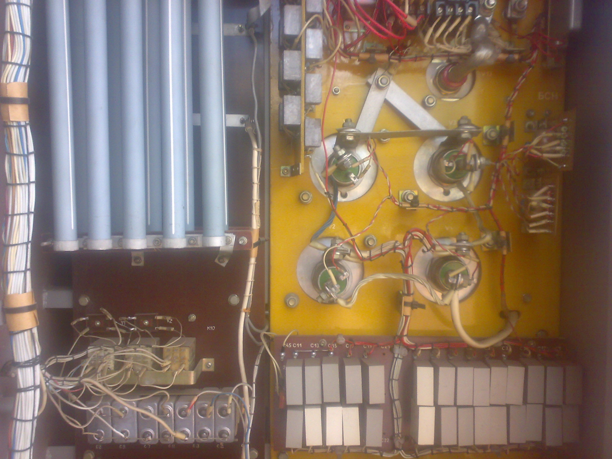 Снизу 2-й автомат (я думаю это магнитное реле) при принудительном включении начинают шуметь вентилаторы, оба (средние на фото) трансформатора, на панели удается выбрать частоту и амплитуду, но между "+" и "-" все равно тихо, при их КЗ тоже не искрит. ПРобовал параллельно с ключом К4(тот 2-й автомат) еще нажимать К5,6,7(желтые)-при их нажатии появляется свист. При нажатии К12,13,14 свиста нет. Но во всех слячаях искра не появляется.