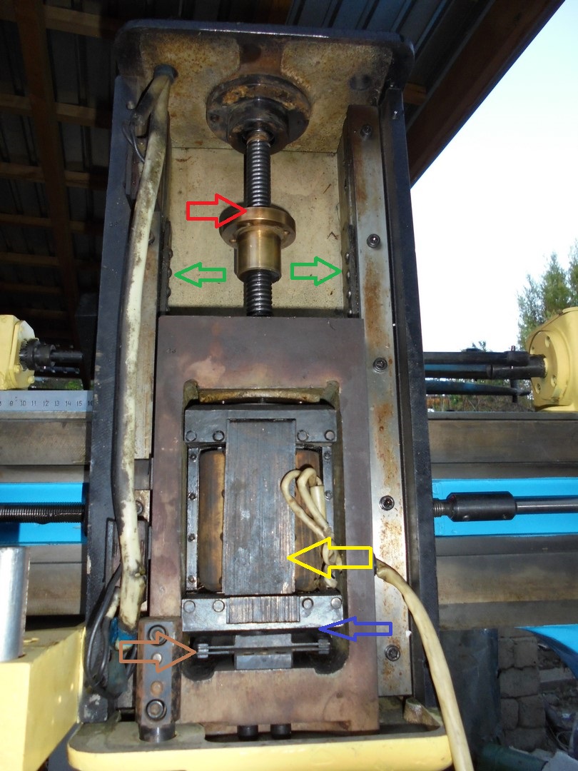 Красная стрелка - трапецивидный винт + гайка (пока откручены). Этот винт таскает всю голову вверх/вниз 200мм