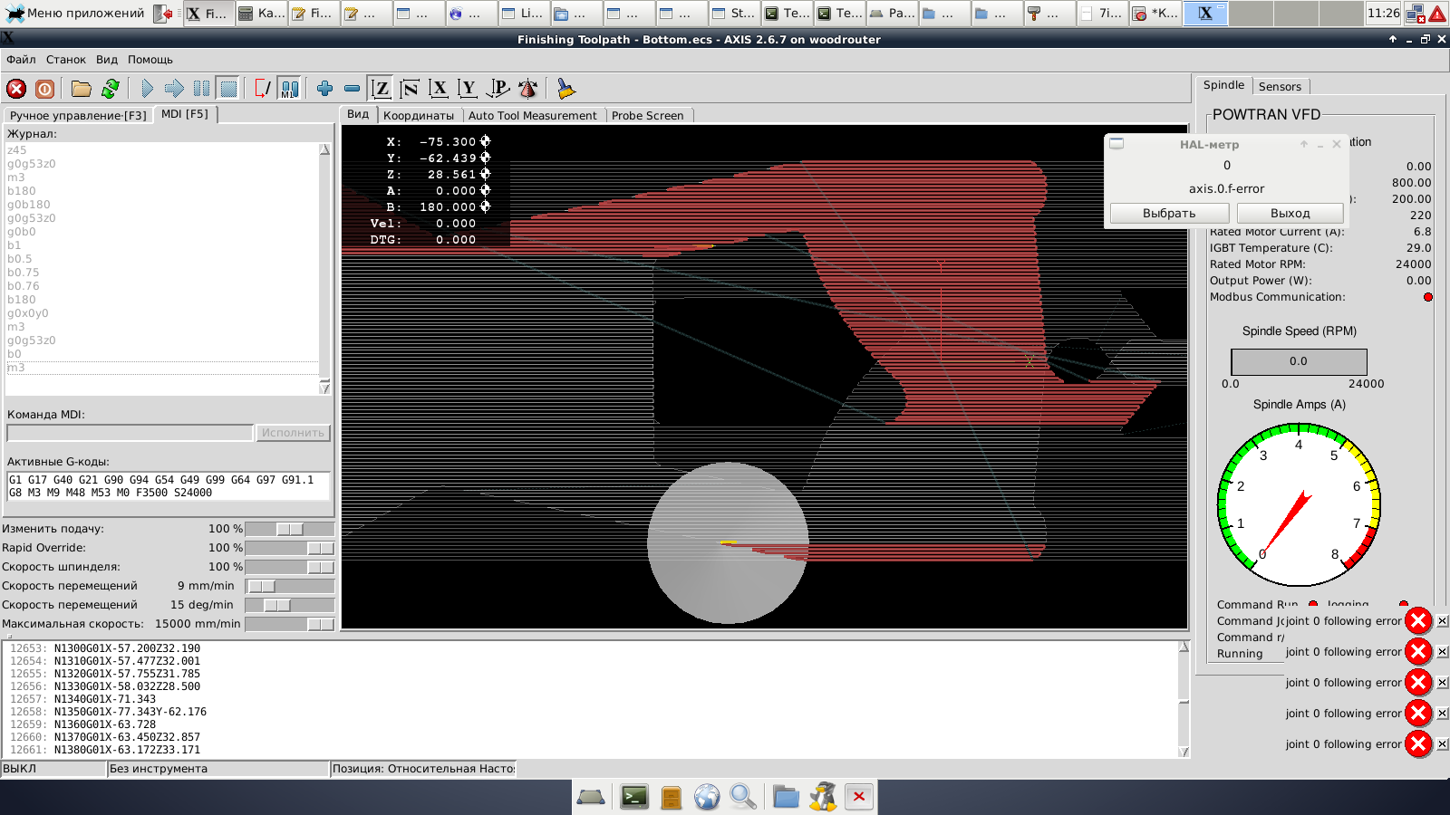 ось X на скрине по горизонтале. ошибка в середине координаты станка.