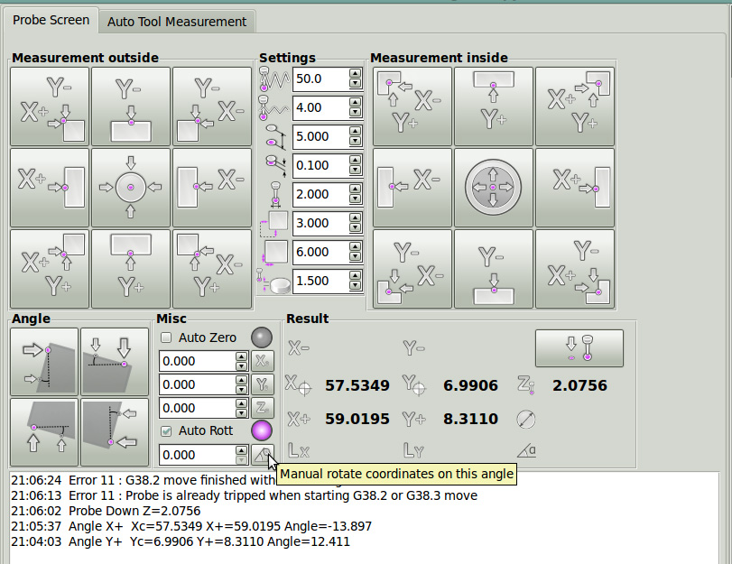 - появилась новая группа измерений "Angle", позволяющая находить угол и поворачивать координатную систему под заготовку, как автоматически, так и вручную, с выбором центра вращения,