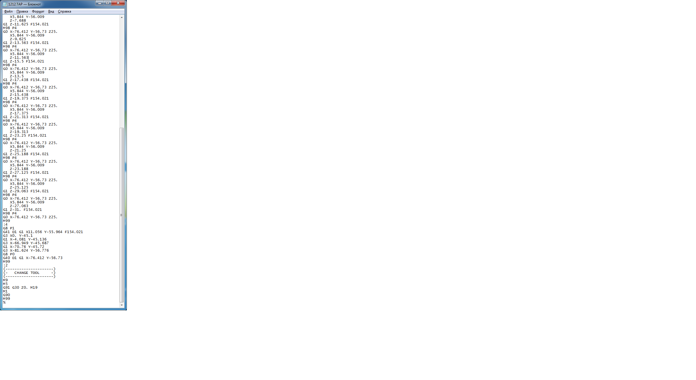 Смену инструмента в каме (УП) не задавал изначально, он меня никуда и не ломился, это я его сначала через симуляцию в комоушине проверял (много непонятных кодов, да и проверить перед пуском полюбас надо) и там сразу с первой строки пошли проблемы, сща блокнот выложу