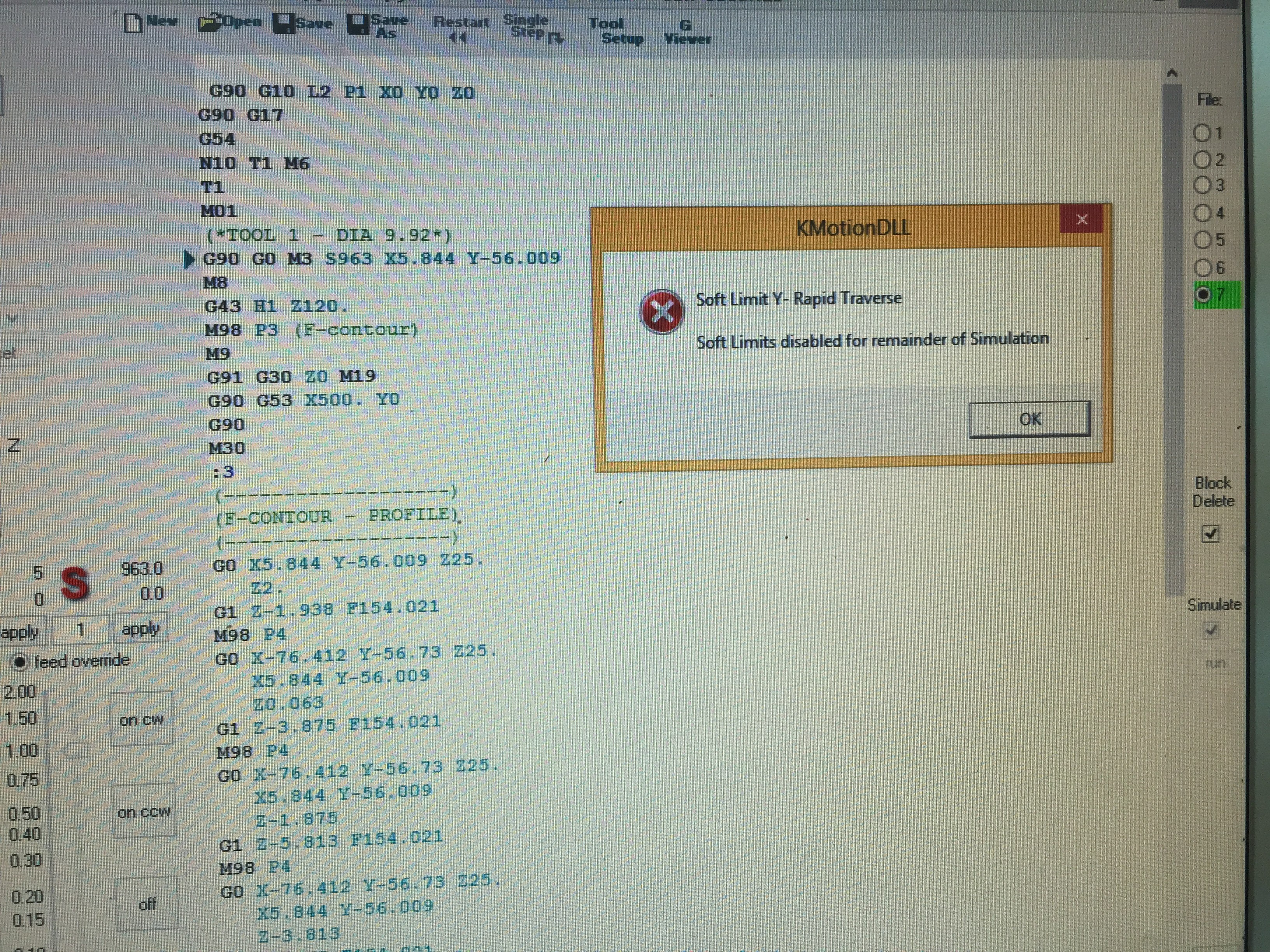 А вот счас сделал ХОМ перед симуляциец и по другому заругался... я так понял что ему хода по Игрику нехватает - тока у меня Игрика 150мм, а деталь посредине стоит... и она маленькая 30х40мм