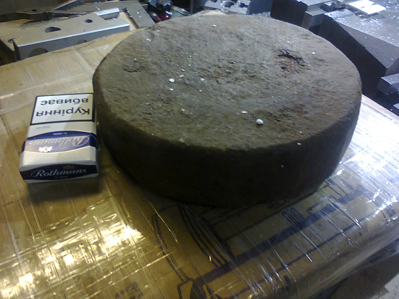 Ещё одна железяка - заготовка на планшайбу. Вид не очень, но под ржавчиной железо. Ткнул сверлом. Берется туго. Стружка сильно блестящая.